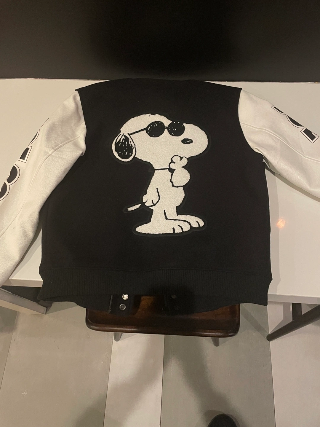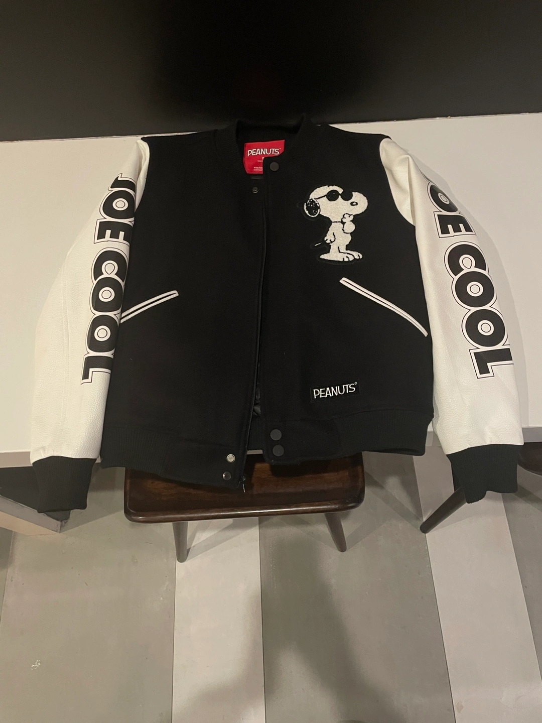 A varsity jacket featuring Snoopy. Black body with white sleeves. The sleeves have the phrase "BE COOL". IN GOOD CONDITIONS