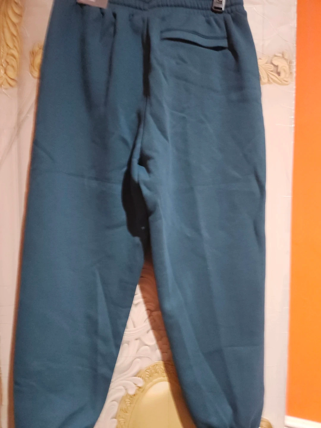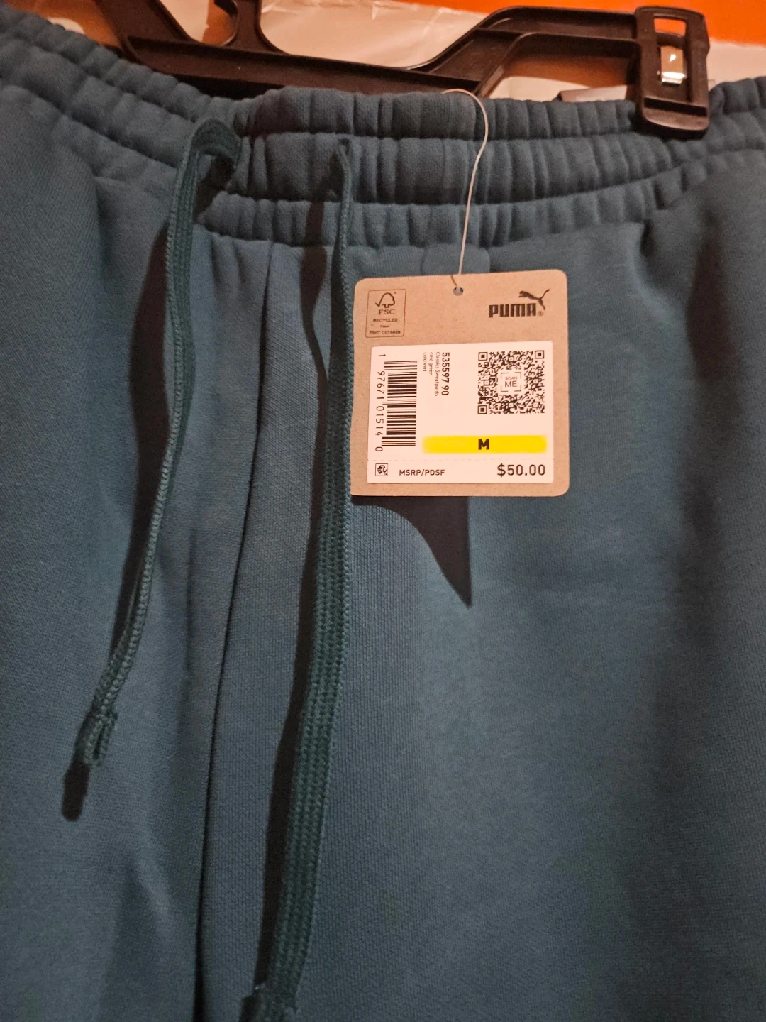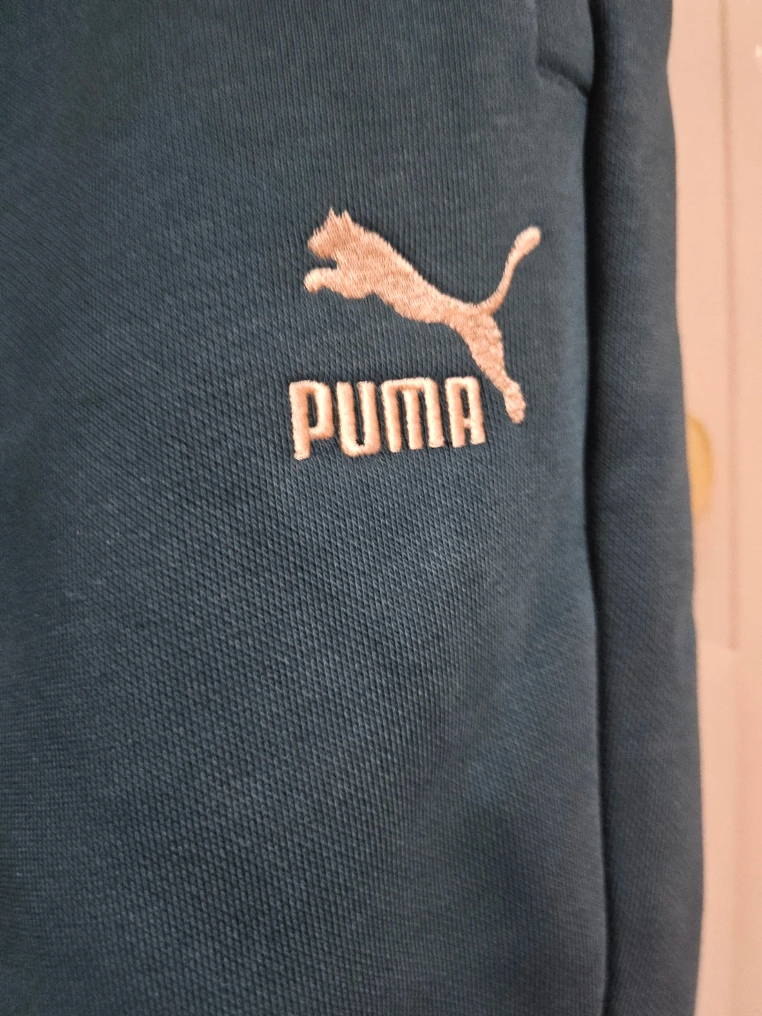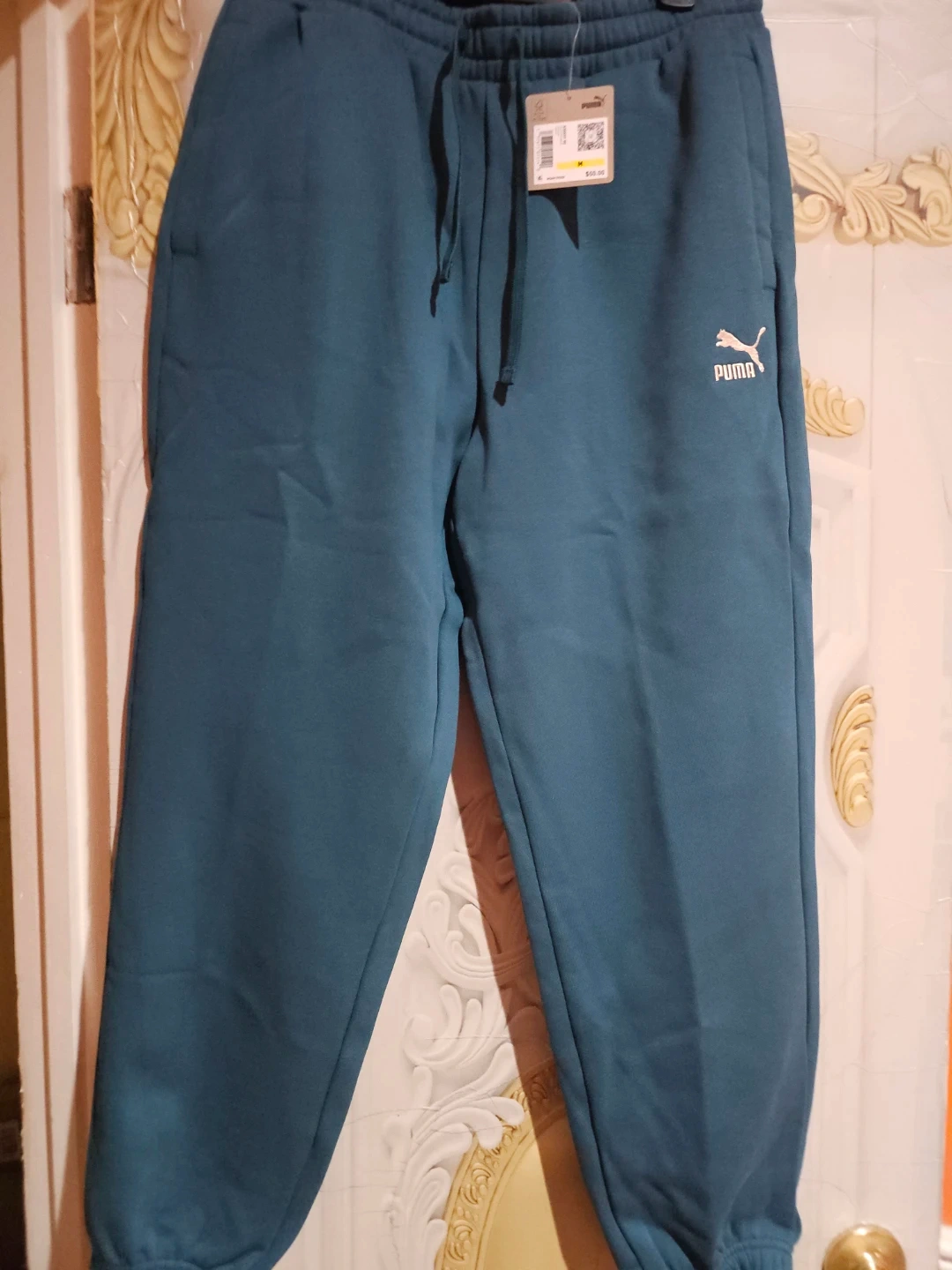 These are Puma brand teal sweatpants. They're size medium and feature the classic Puma logo embroidered on the front. Made with a comfortable fabric blend for everyday wear.