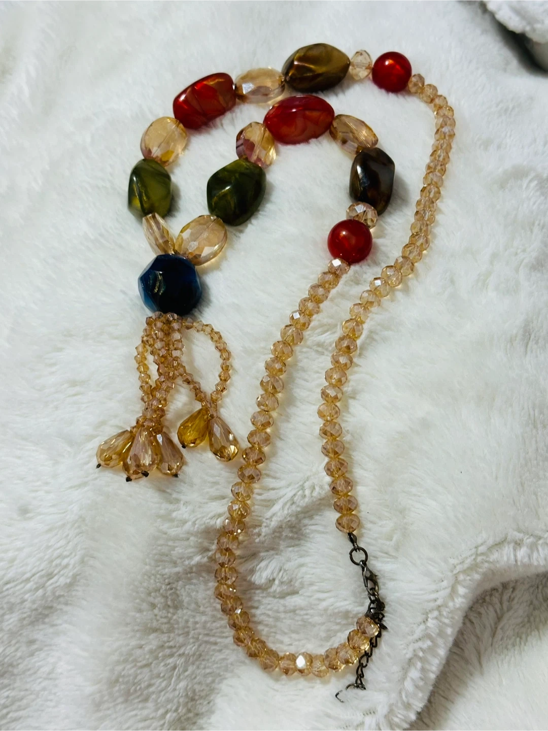 This beaded necklace features a mix of smooth, oval-shaped stones in red, green, and brown, interspersed with clear and amber faceted beads. It has a dark blue centerpiece and a delicate amber-toned bead tassel. The necklace is finished with a metal clasp.