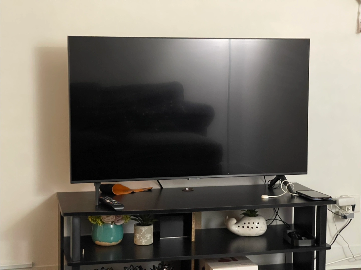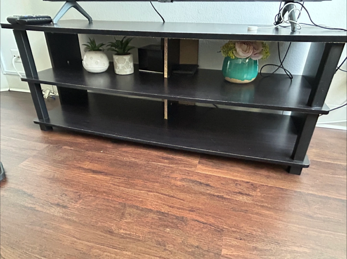 Selling a black TV stand in good condition! It offers a sleek and functional design with multiple shelves for storage. Perfect for organizing your media devices and accessories