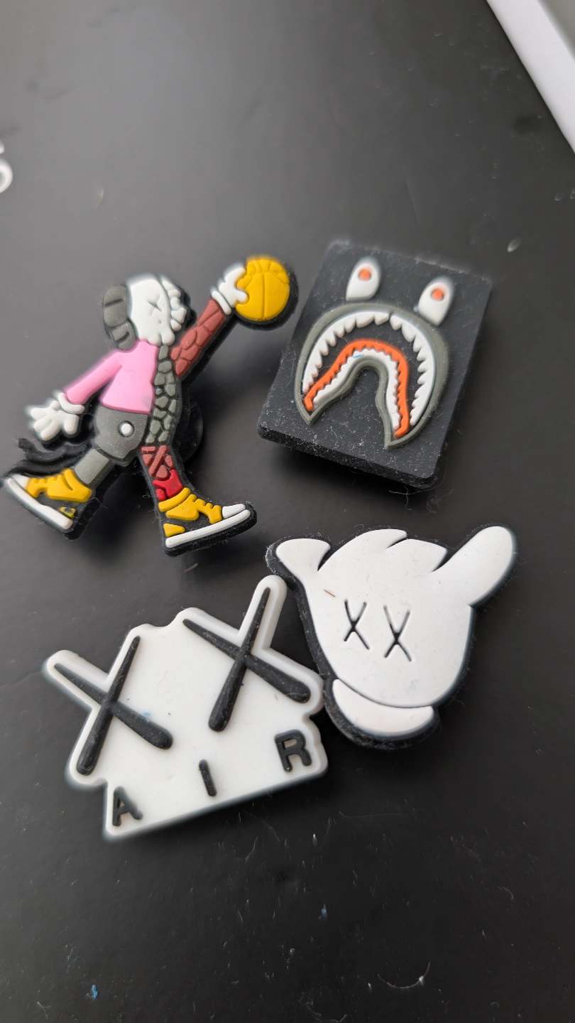 Four unique shoe charms. Features various designs including a basketball player, shark head, sad bear glove and Air logo. Great for customizing footwear for affordable price.