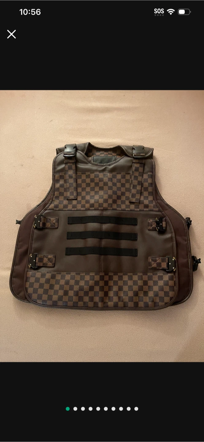 Here's a brown checkered tactical vest. It's a unique piece that could be used for cosplay or as a statement piece!