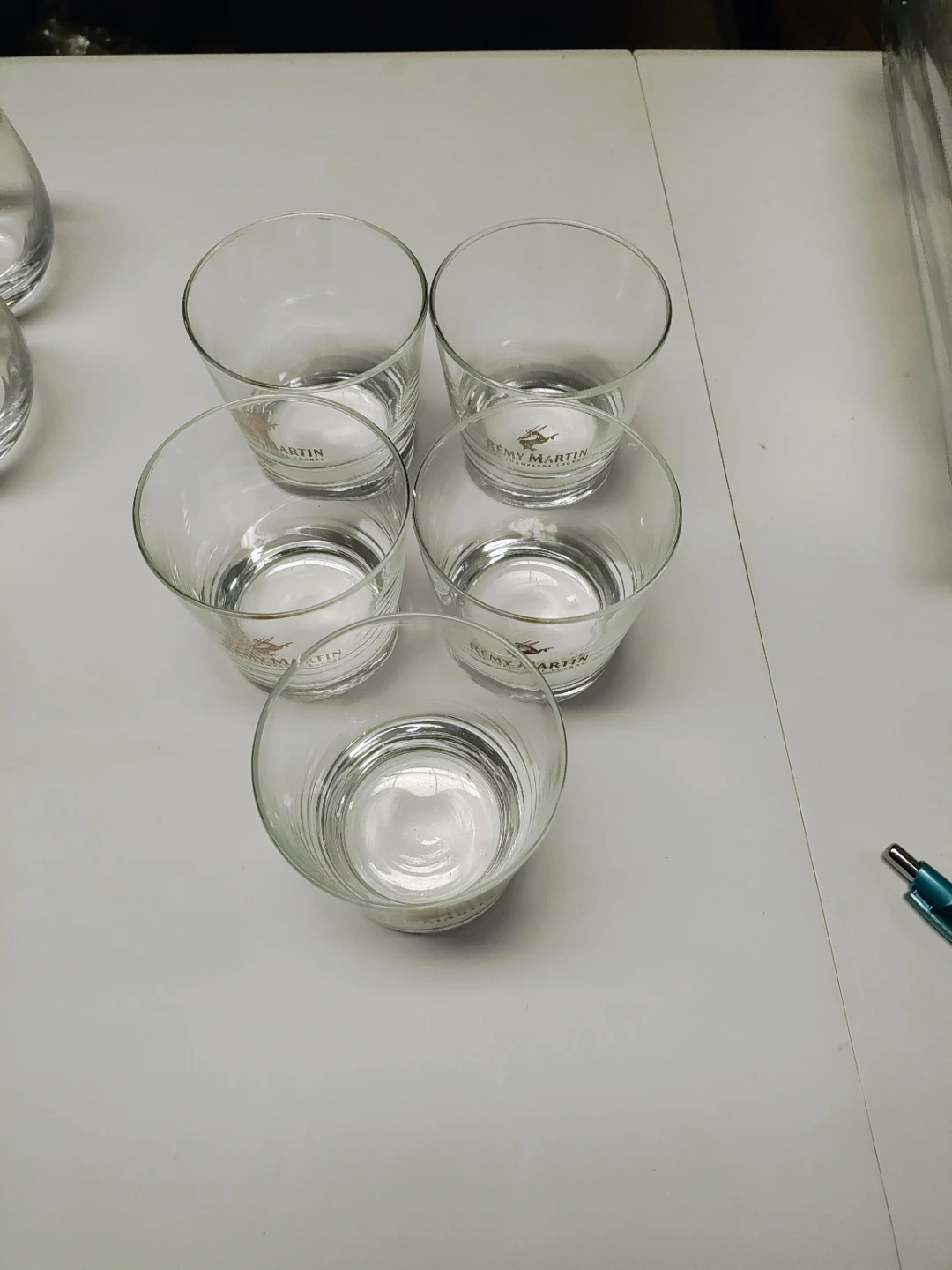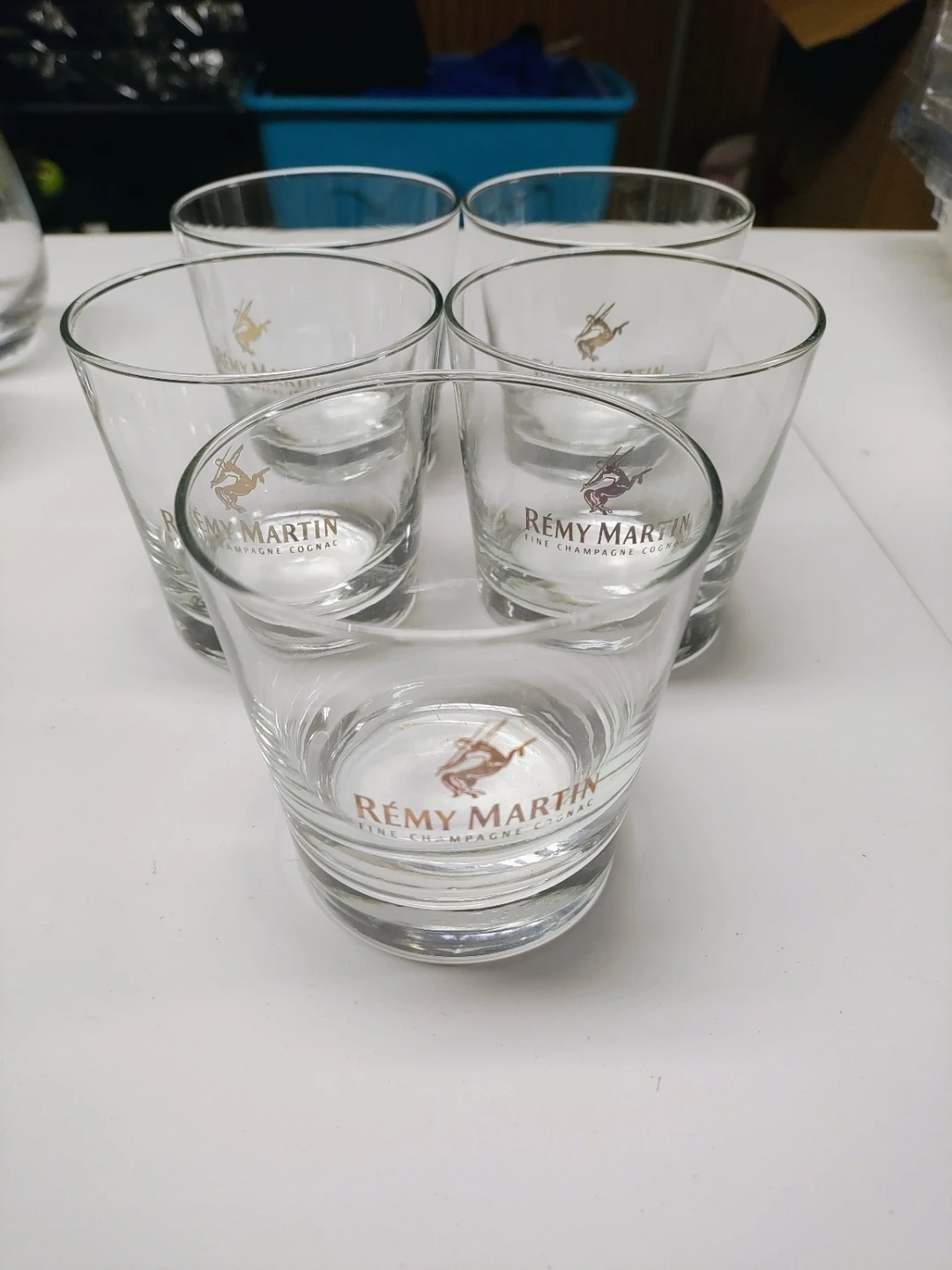 This is a set of five Remy Martin drinking glasses. They are made of clear glass with the Remy Martin logo and "Fine Champagne Cognac" printed on them. These glasses are perfect for serving drinks. Approximately 3.25" tall. Cash only pick up only