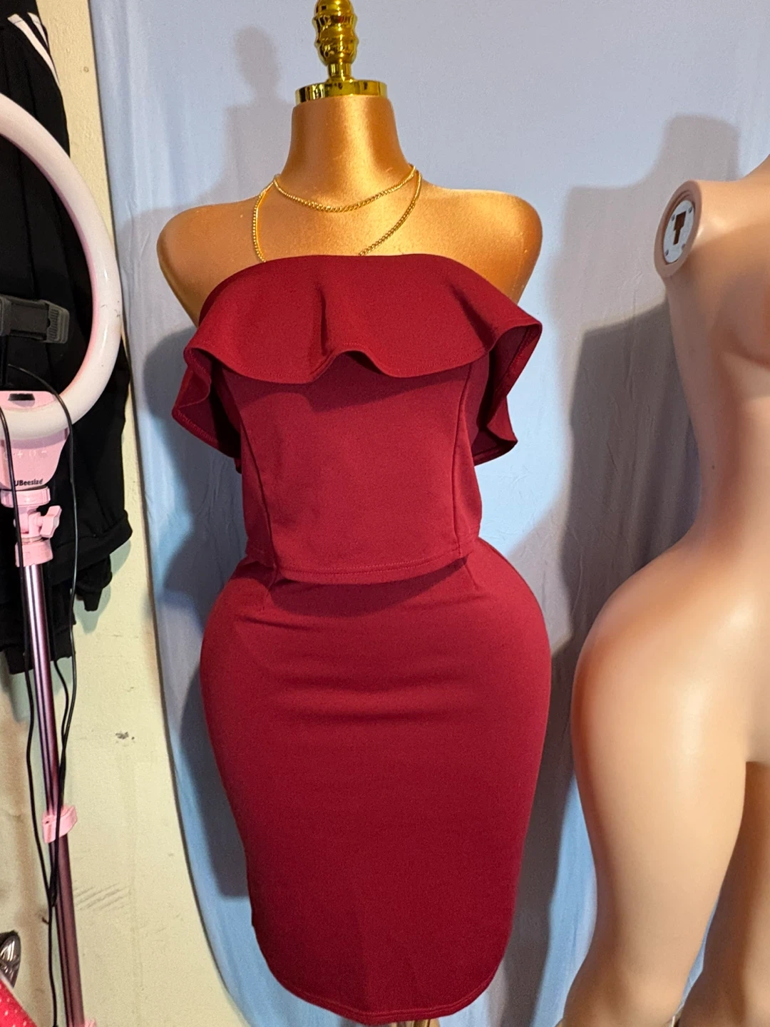 This stylish red dress features an off-the-shoulder neckline with a ruffle detail. It's a strapless, form-fitting design. This dress is great for a night out!