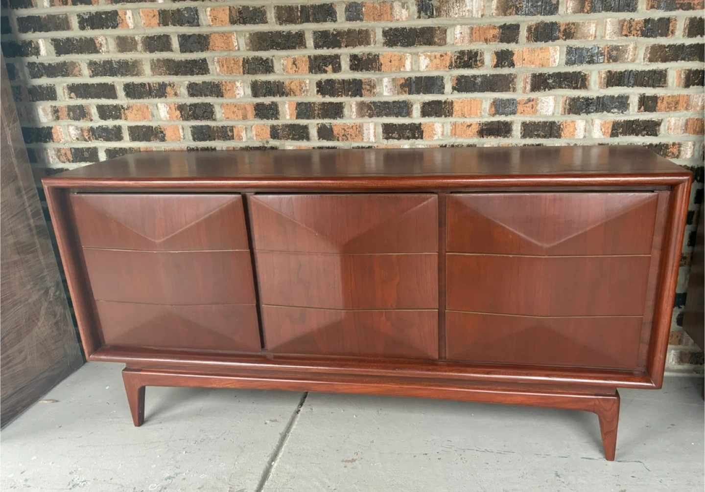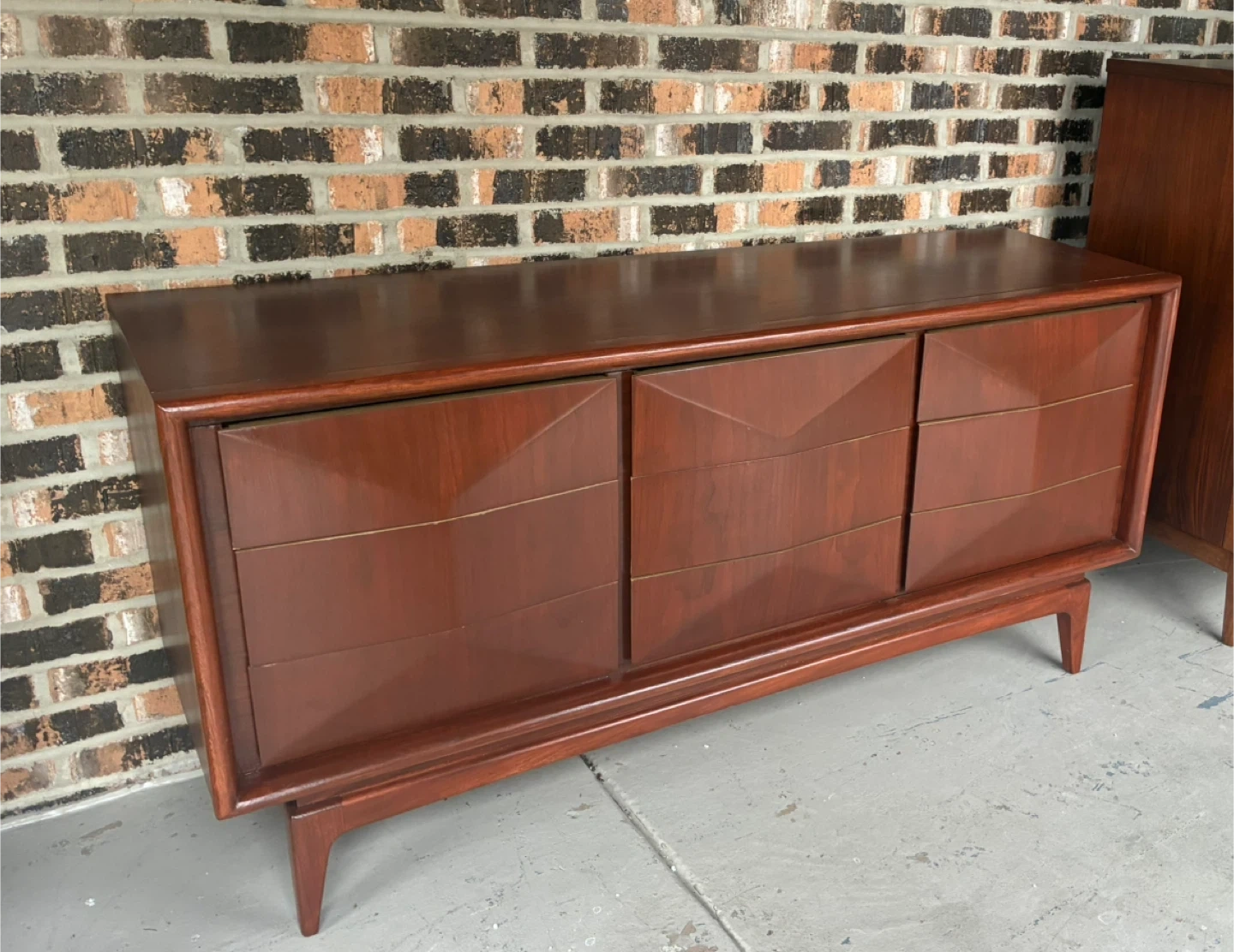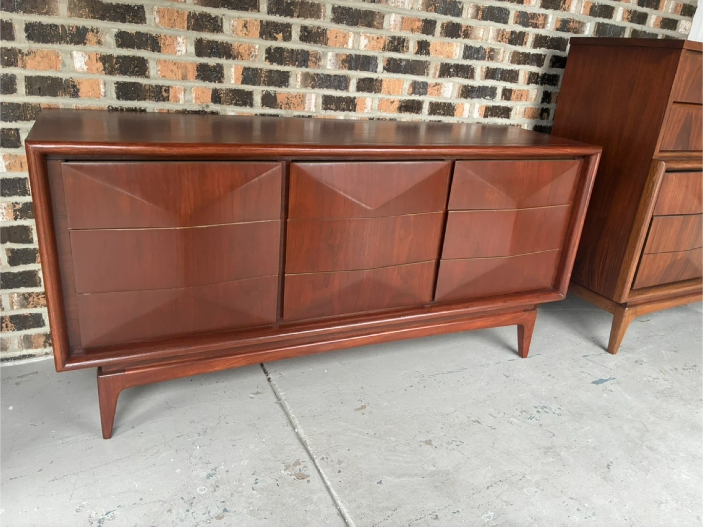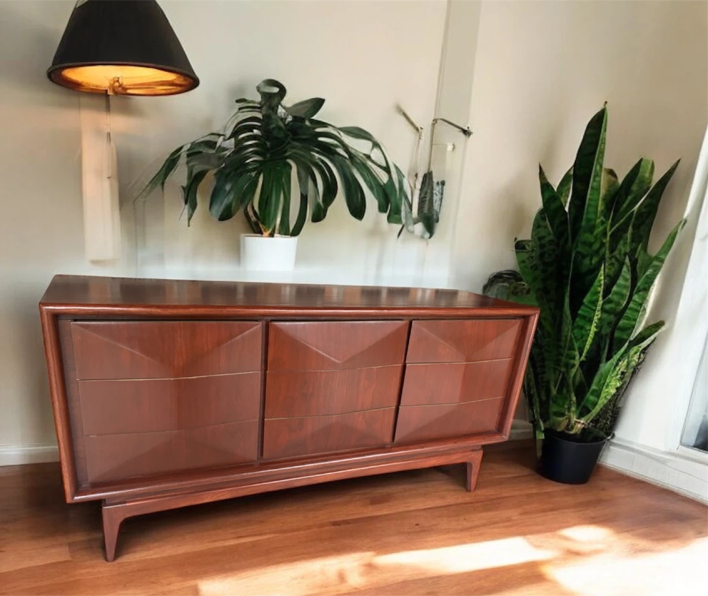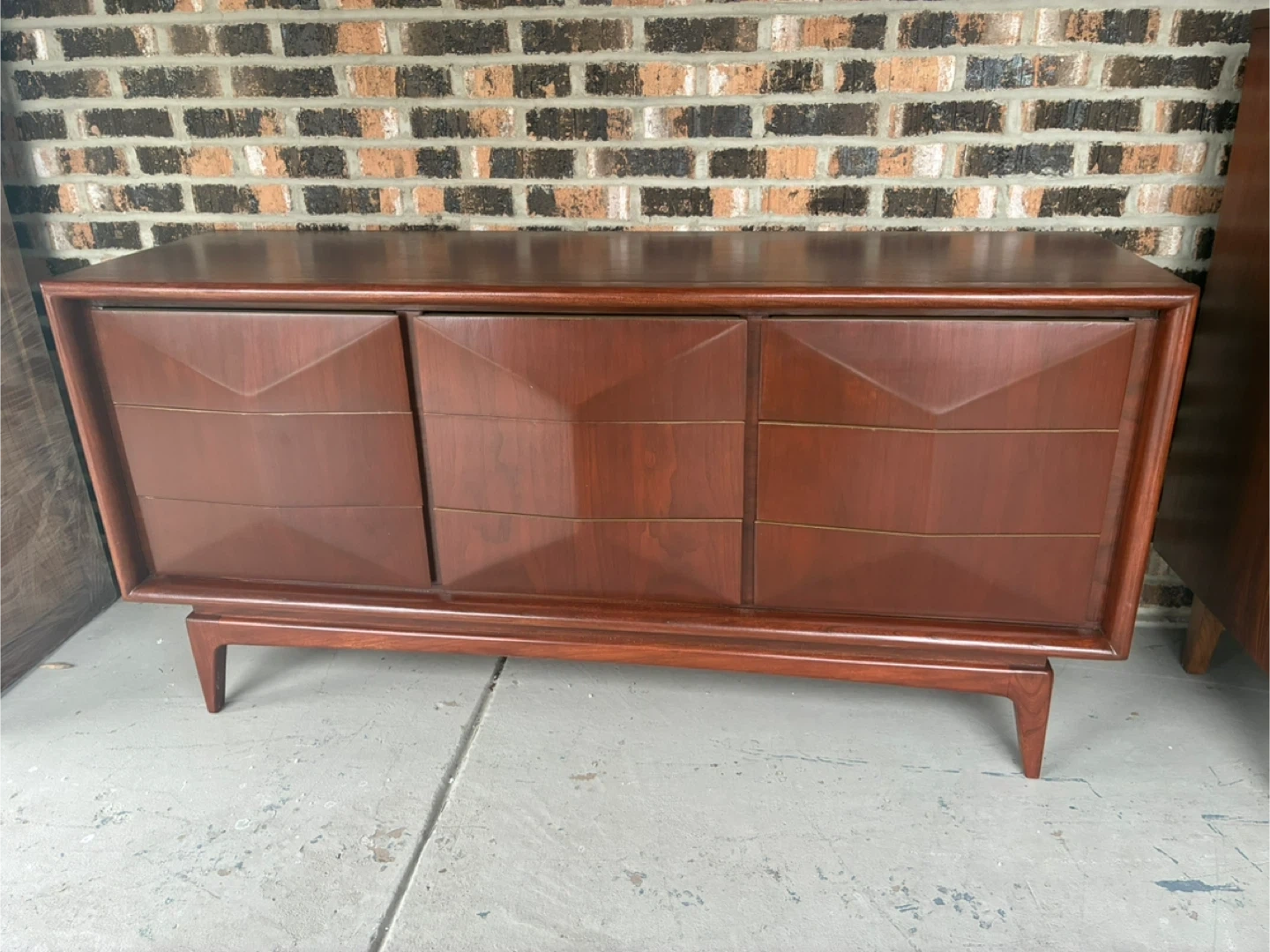 This 1960s vintage mid century modern lowboy dresser by United Furniture features the brand’s iconic Diamond Front design, defined by sculpted drawer faces that create a subtle geometric rhythm across the facade. In great vintage condition