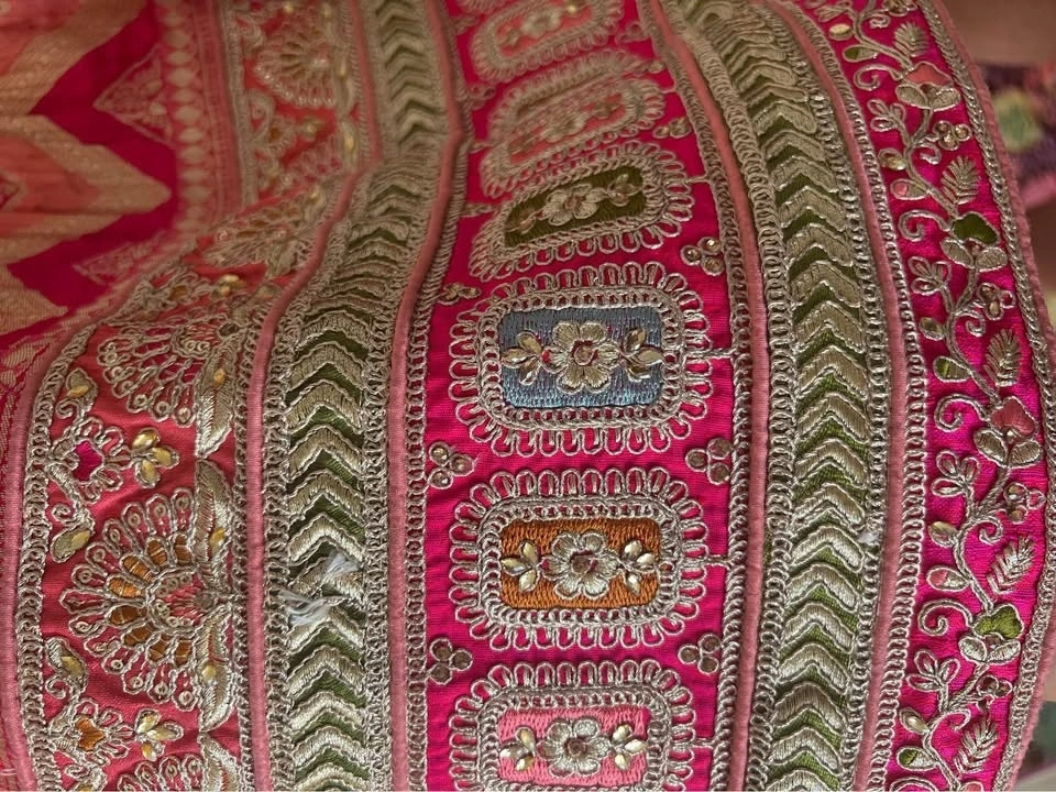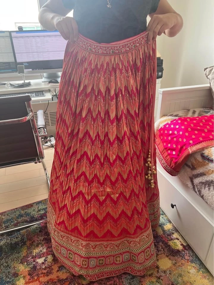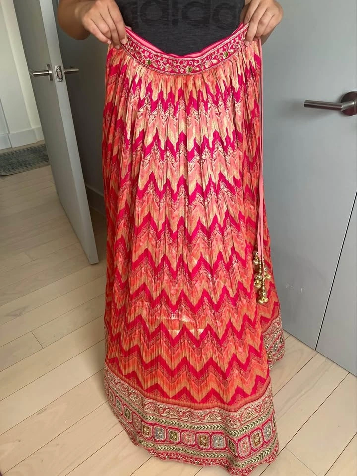 Beautiful organza lehenga with handmade embroidery. New skirt and scarf, directly from Delhi, India. Bought for my Indian wedding but ended up wearing a different dress. New, never worn. Perfect for a bridal outfit or wedding party. The skirt can be adjusted with laces. All silk. Includes rattan to give puffiness to the skirt, but it can be removed.