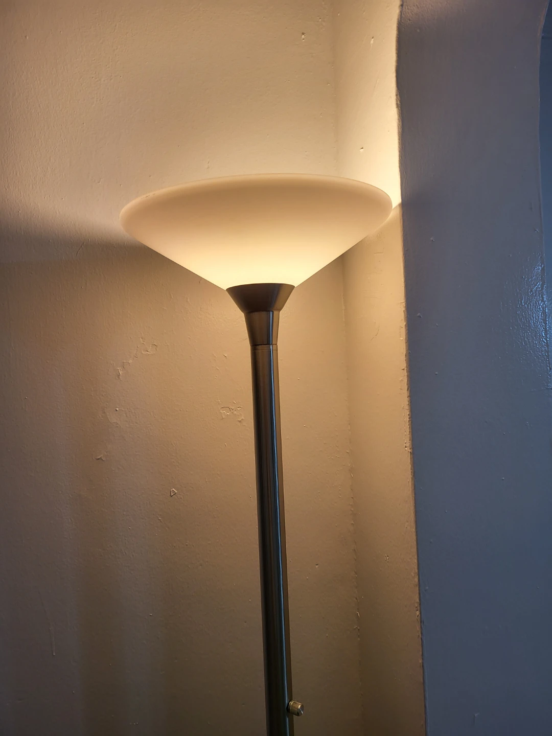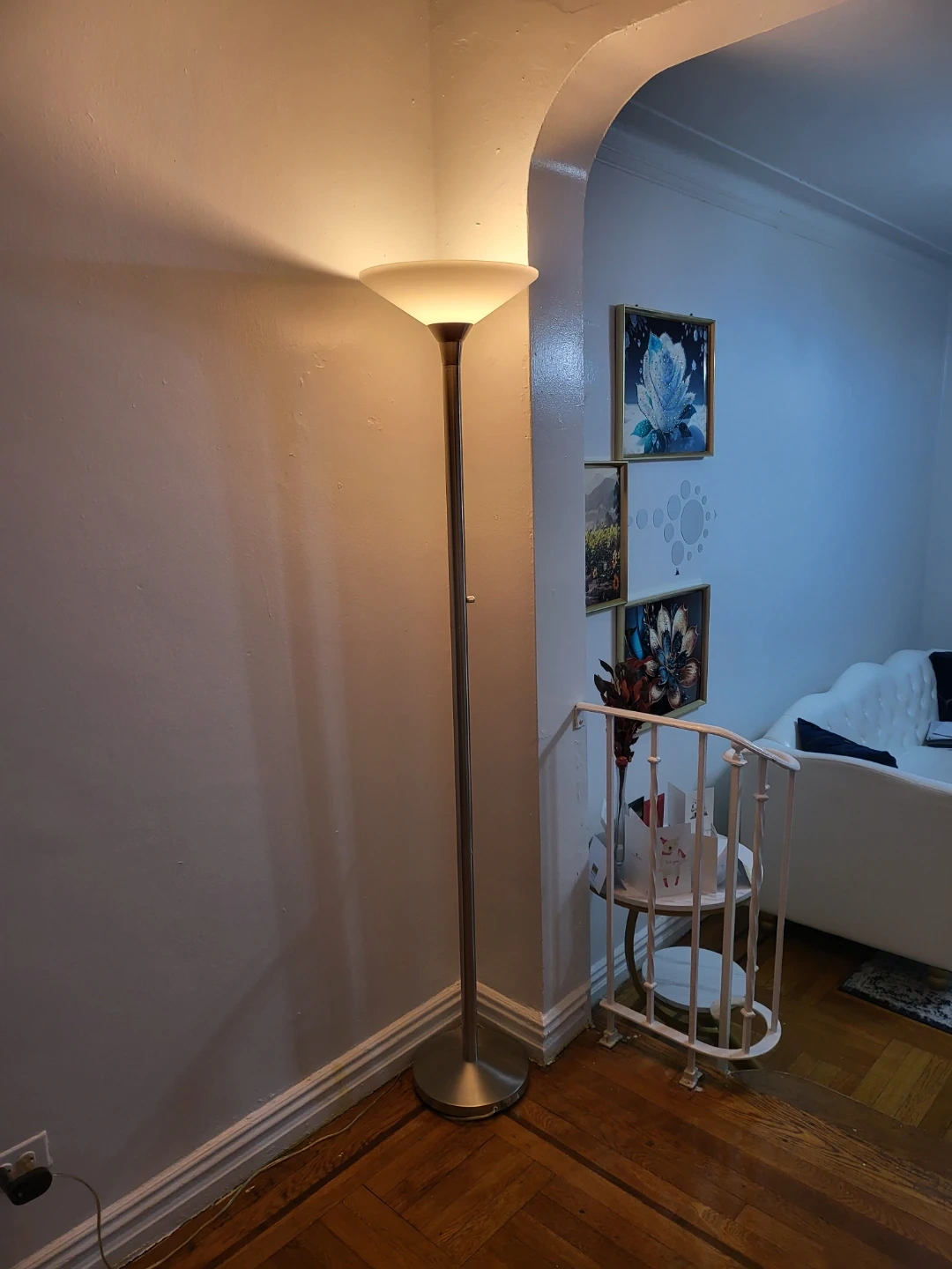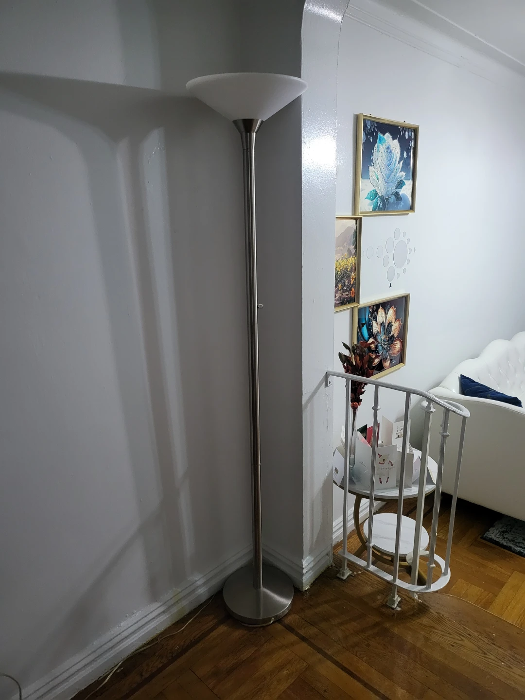 This sleek floor lamp provides ambient lighting for any room. It's made of durable metal with a frosted glass shade. The brushed silver finish complements modern decor. An arc design offers flexible placement.