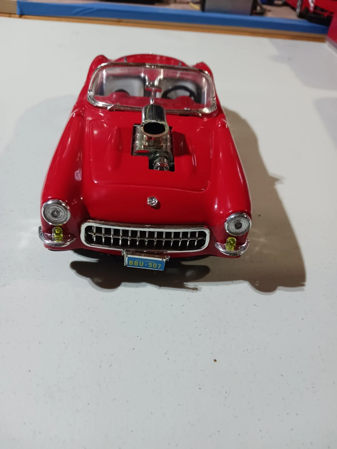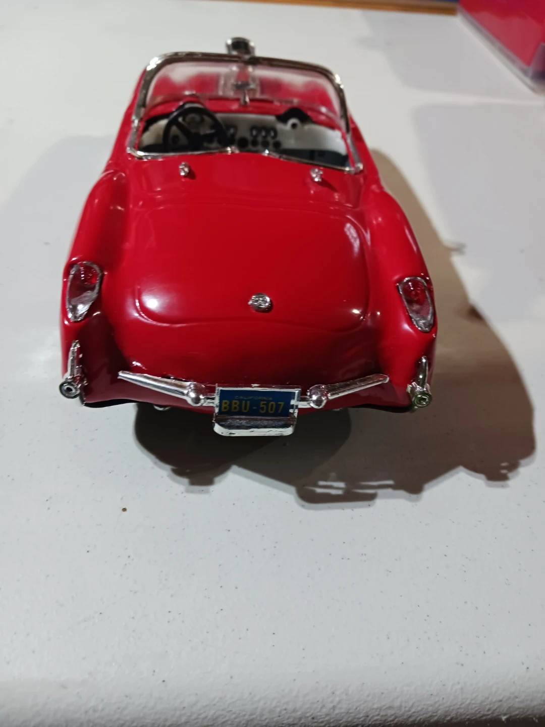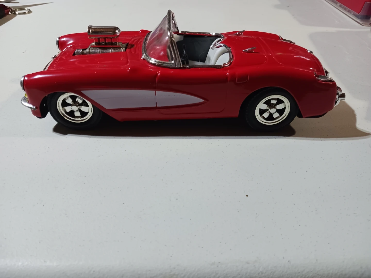 This is a red toy convertible car with a realistic engine and silver trim. It's a fun collectible for car enthusiasts. Features a detailed interior and exterior. I only do pickup