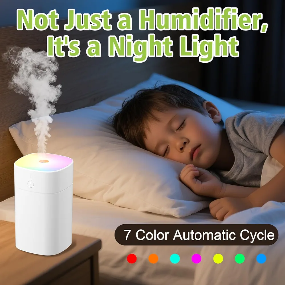 This mini humidifier is perfect for different occasions, whether you're getting up, working, reading a book, doing yoga, or sleeping! It also functions as a night light with a 7 color automatic cycle. It is small but powerful and easy to move around. It holds 400 ml and provides fast humidification and long-lasting moisturizing