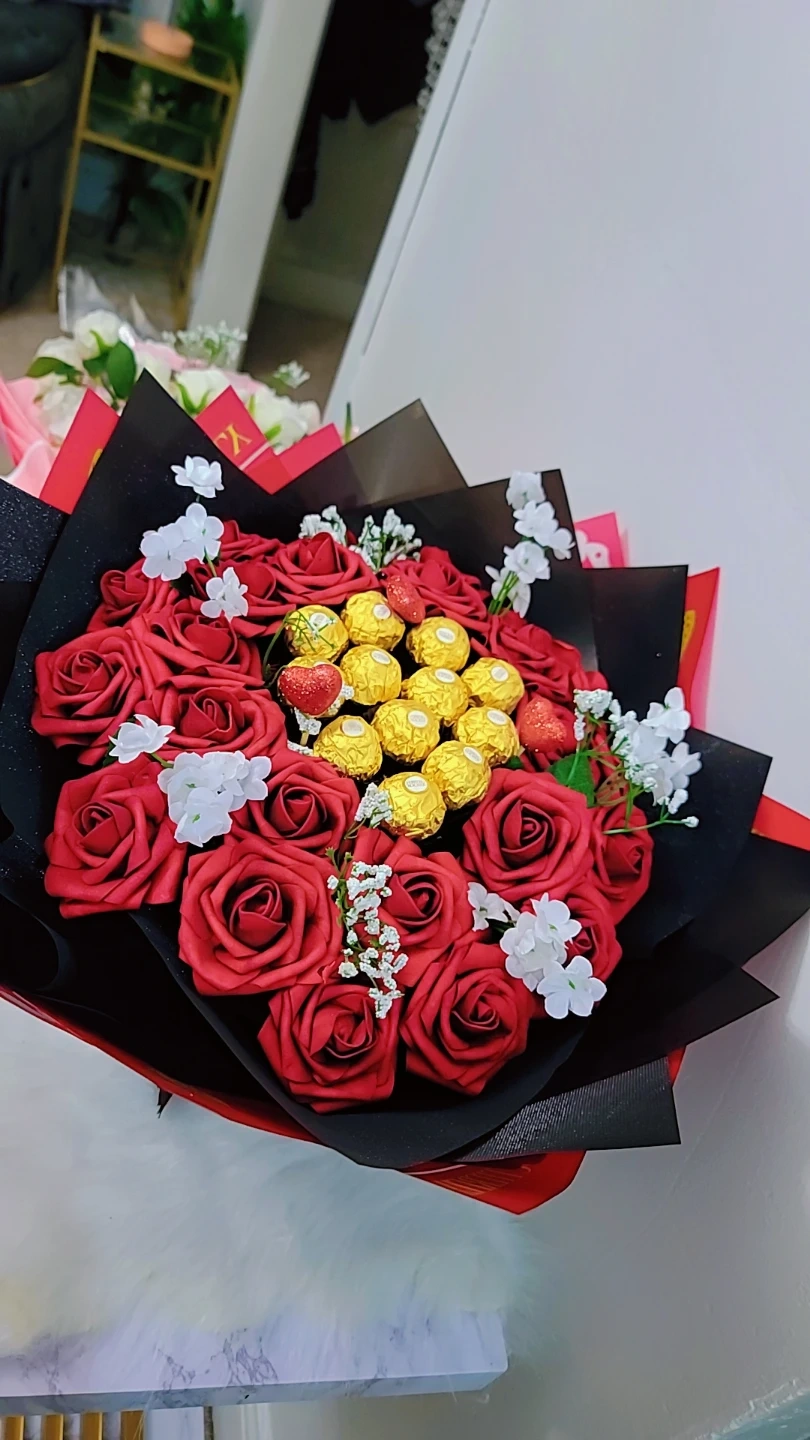 Beautiful bouquet featuring red roses and Ferrero Rocher chocolates. It's a sweet combination for any occasion. Makes a lovely gift!