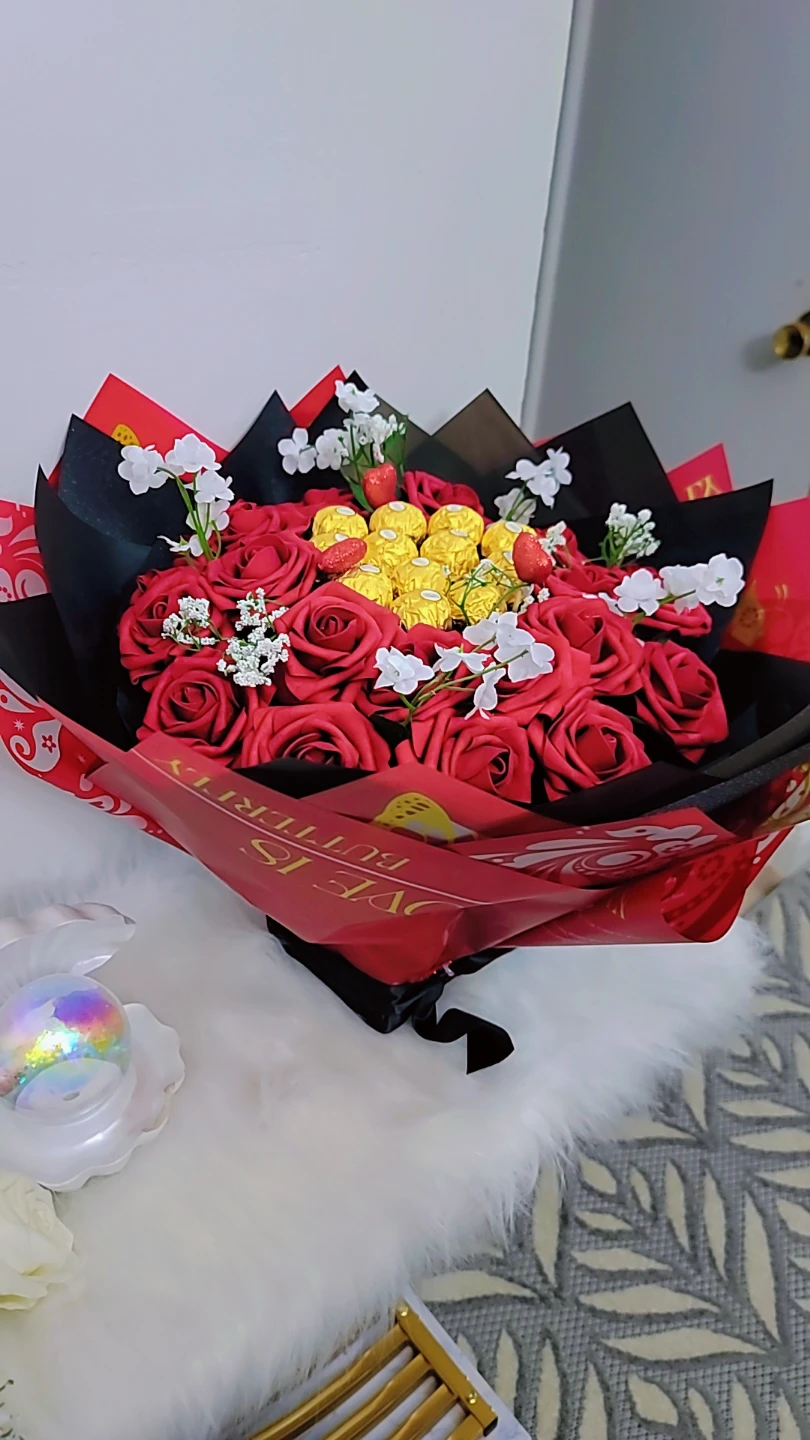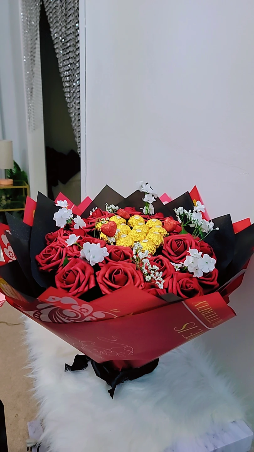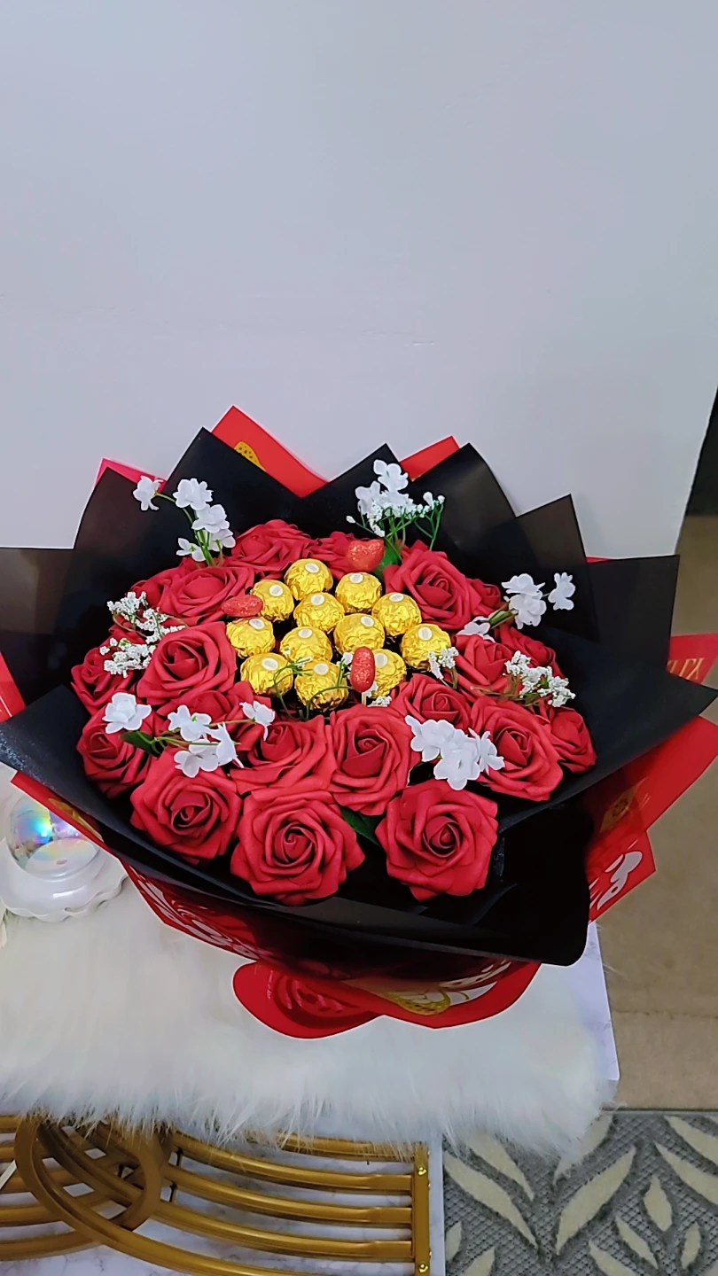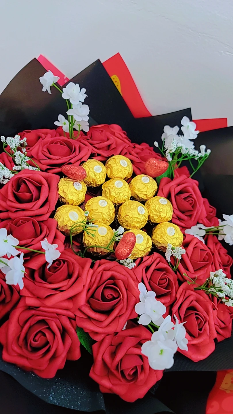 Beautiful bouquet featuring red roses and Ferrero Rocher chocolates. It's a sweet combination for any occasion. Makes a lovely gift!