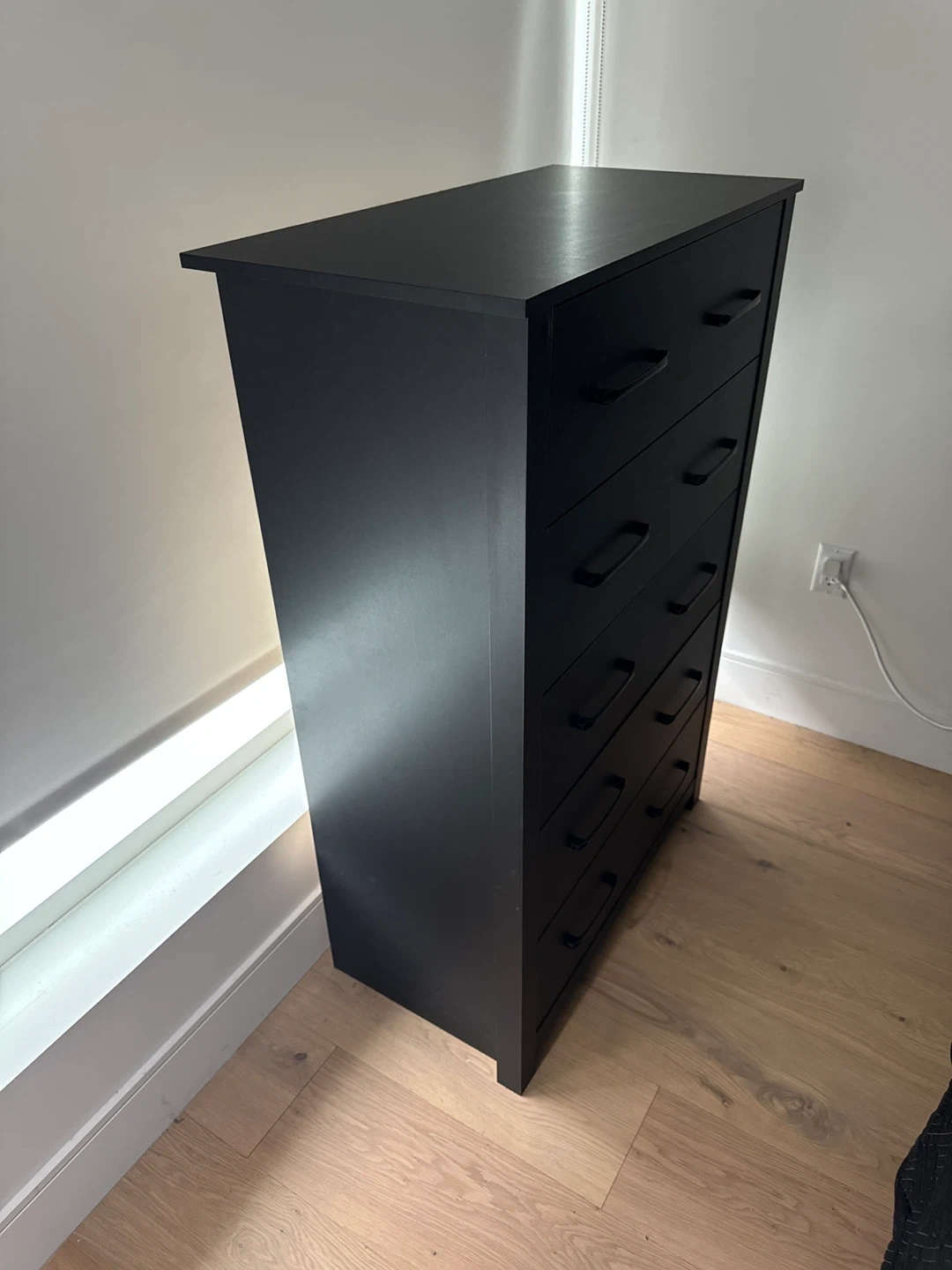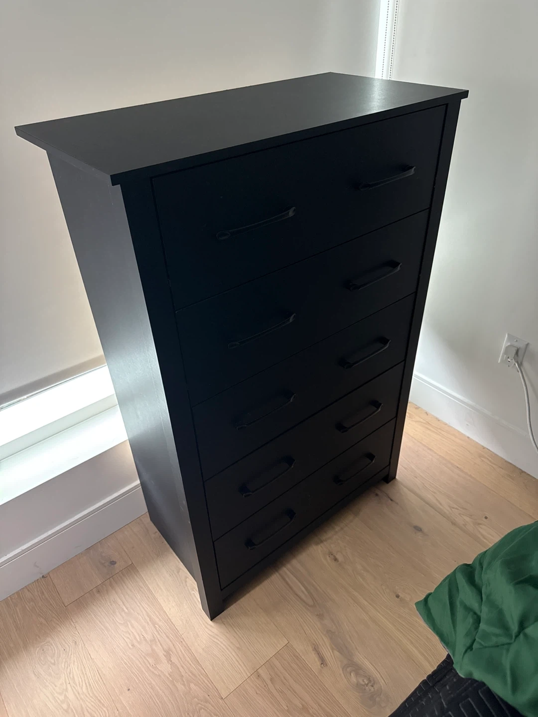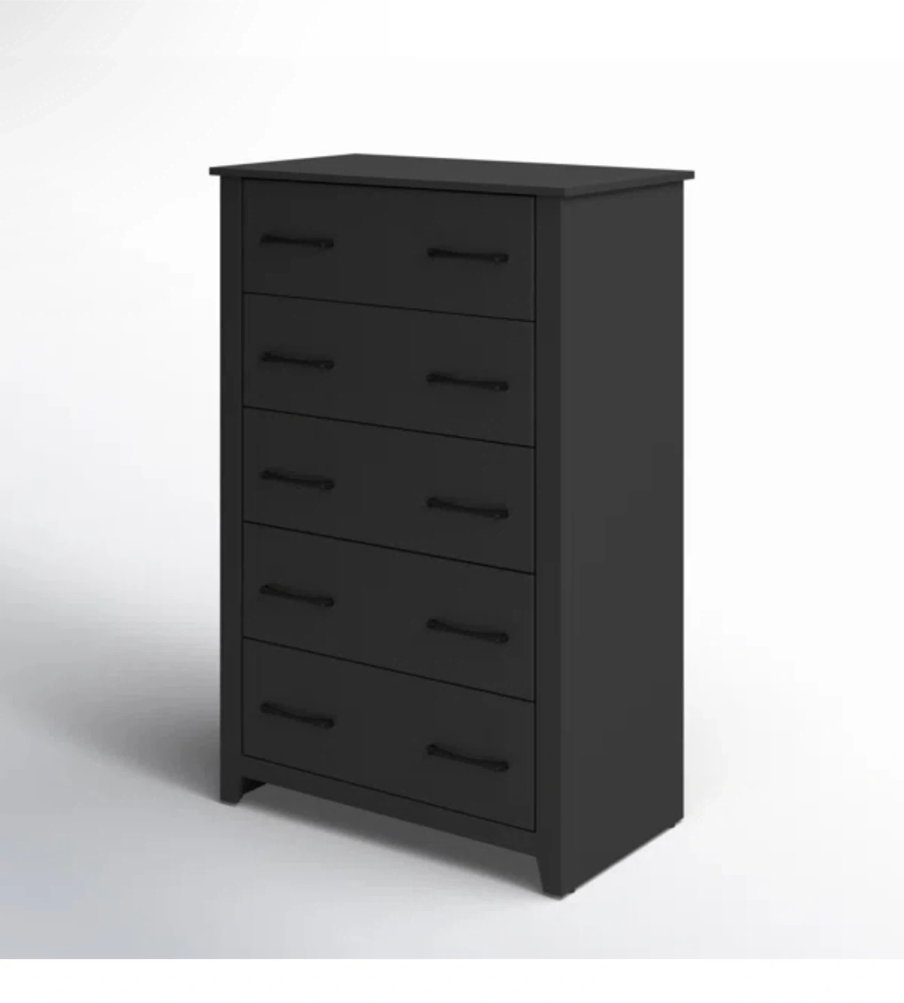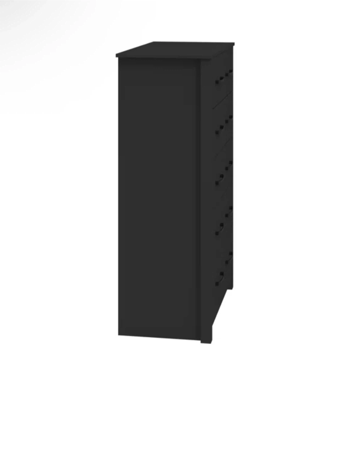 This is a black 5-drawer dresser. It features sleek metal handles and a modern design. The dresser offers ample storage space for clothing and accessories. Willing to negotiate price, need gone ASAP. Must come get, hand truck recommended to help move.
