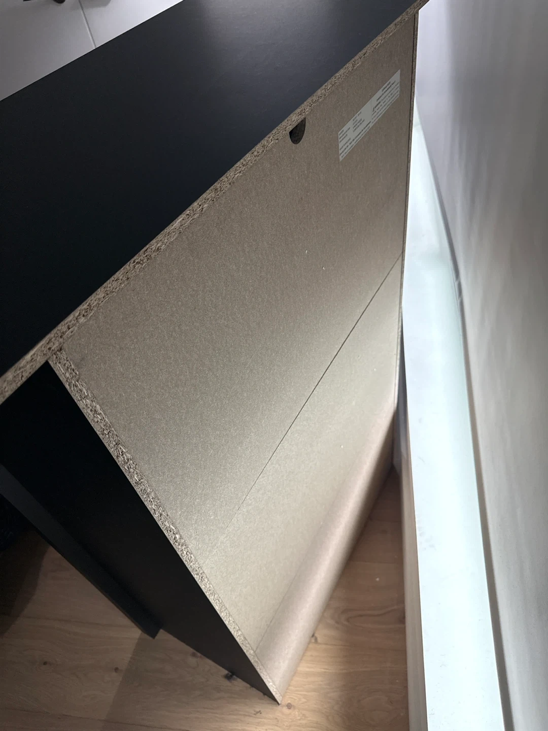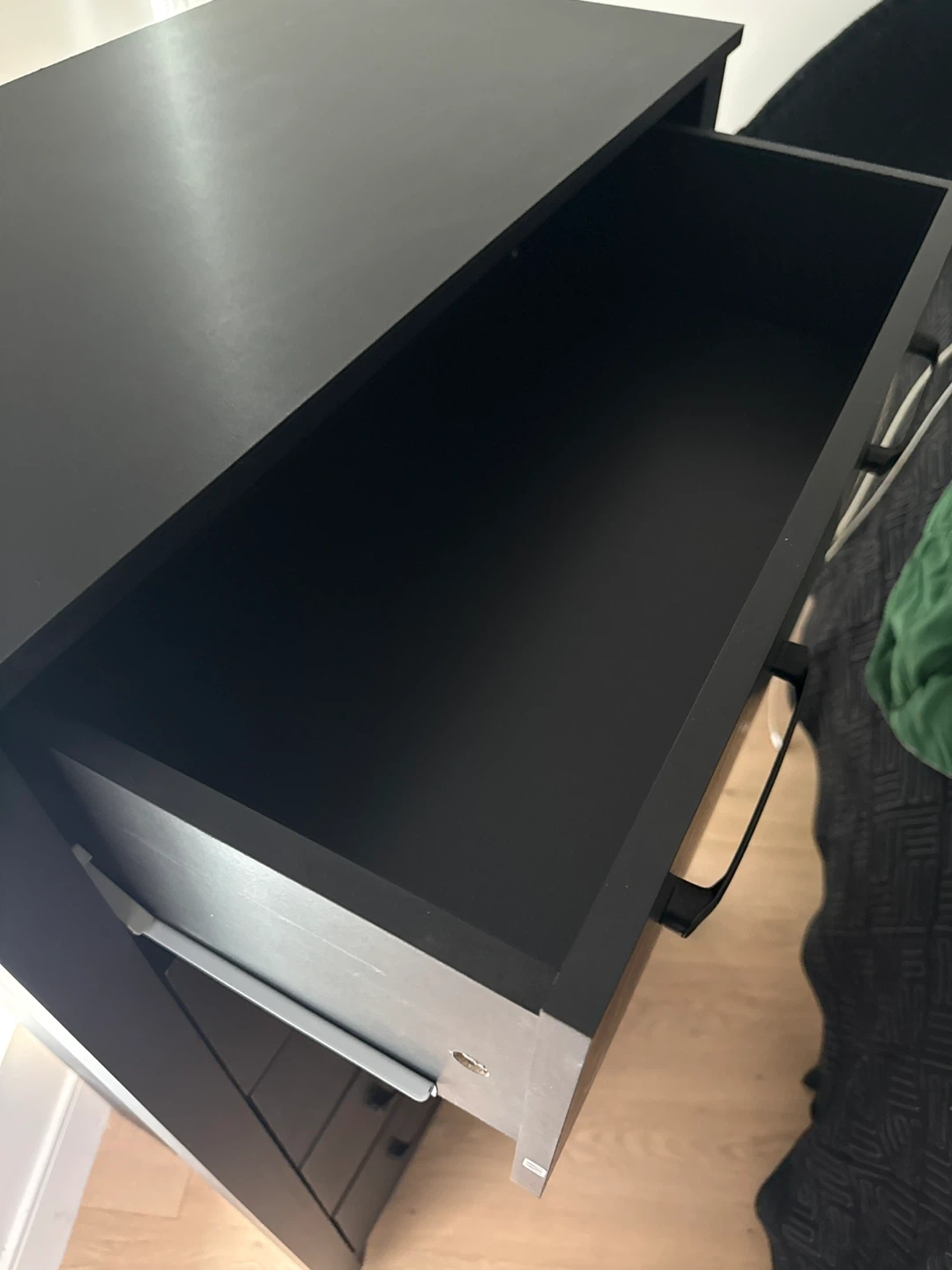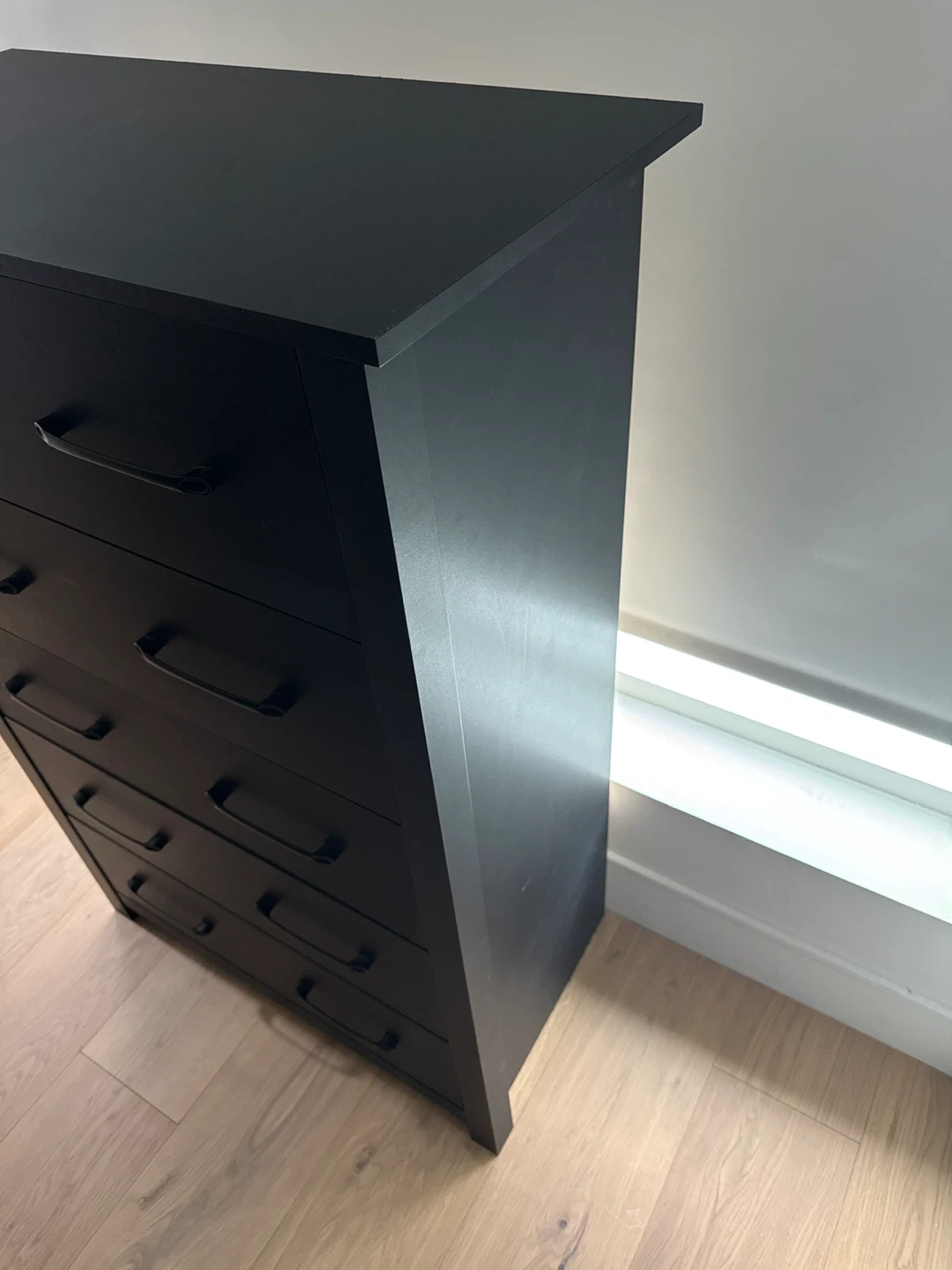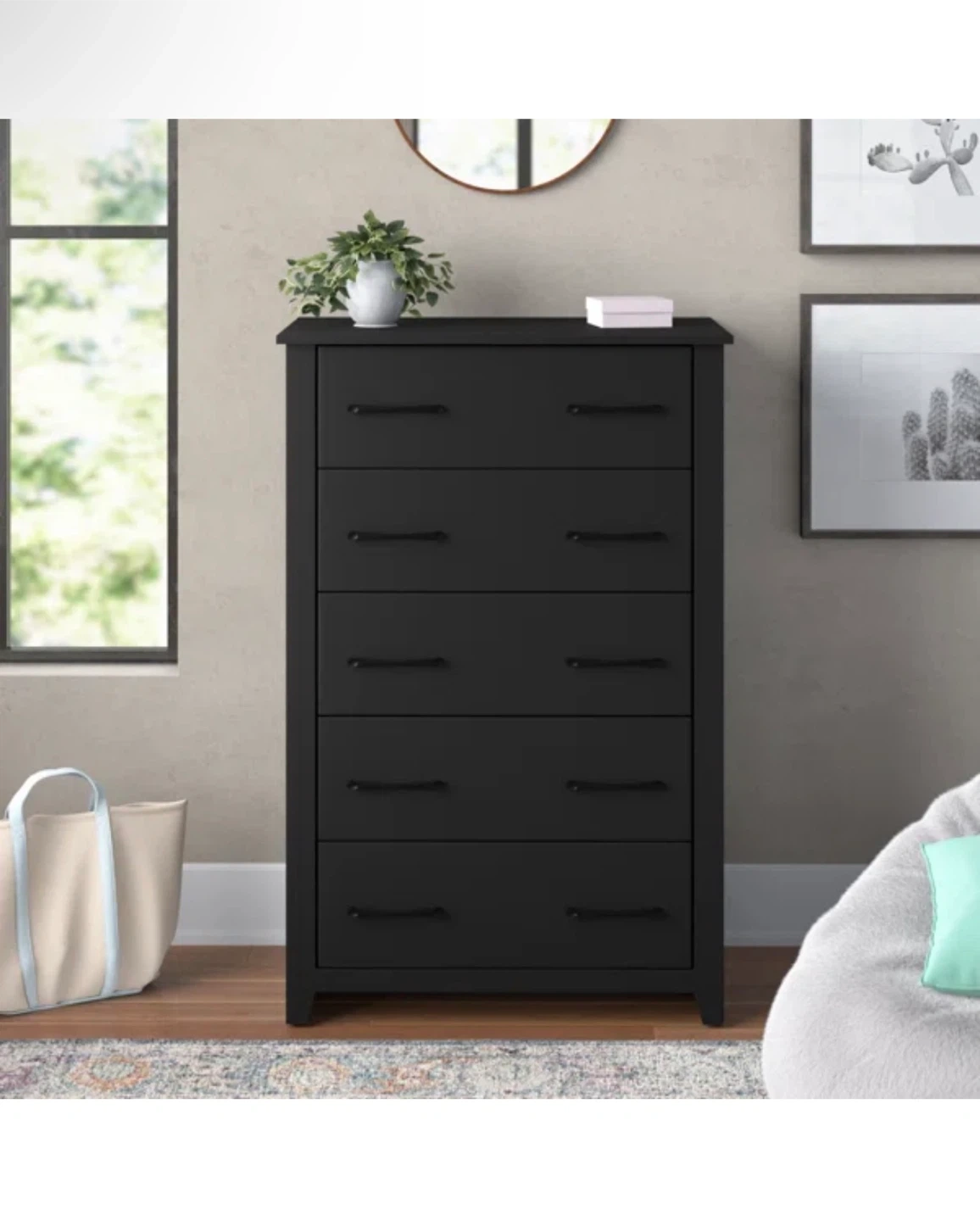 This is a black 5-drawer dresser. It features sleek metal handles and a modern design. The dresser offers ample storage space for clothing and accessories. Willing to negotiate price, need gone ASAP. Must come get, hand truck recommended to help move.