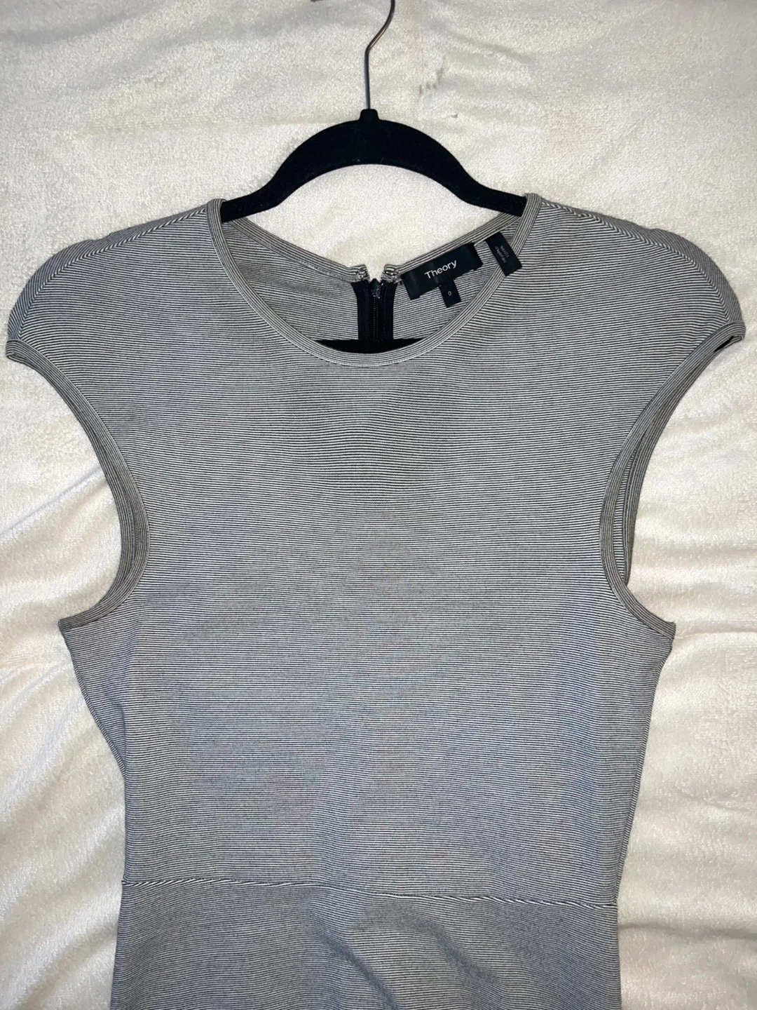 This is a Theory cap sleeve fit and flare dress. It's a size 0 The fabric is a stretchy with a subtle stripe pattern.