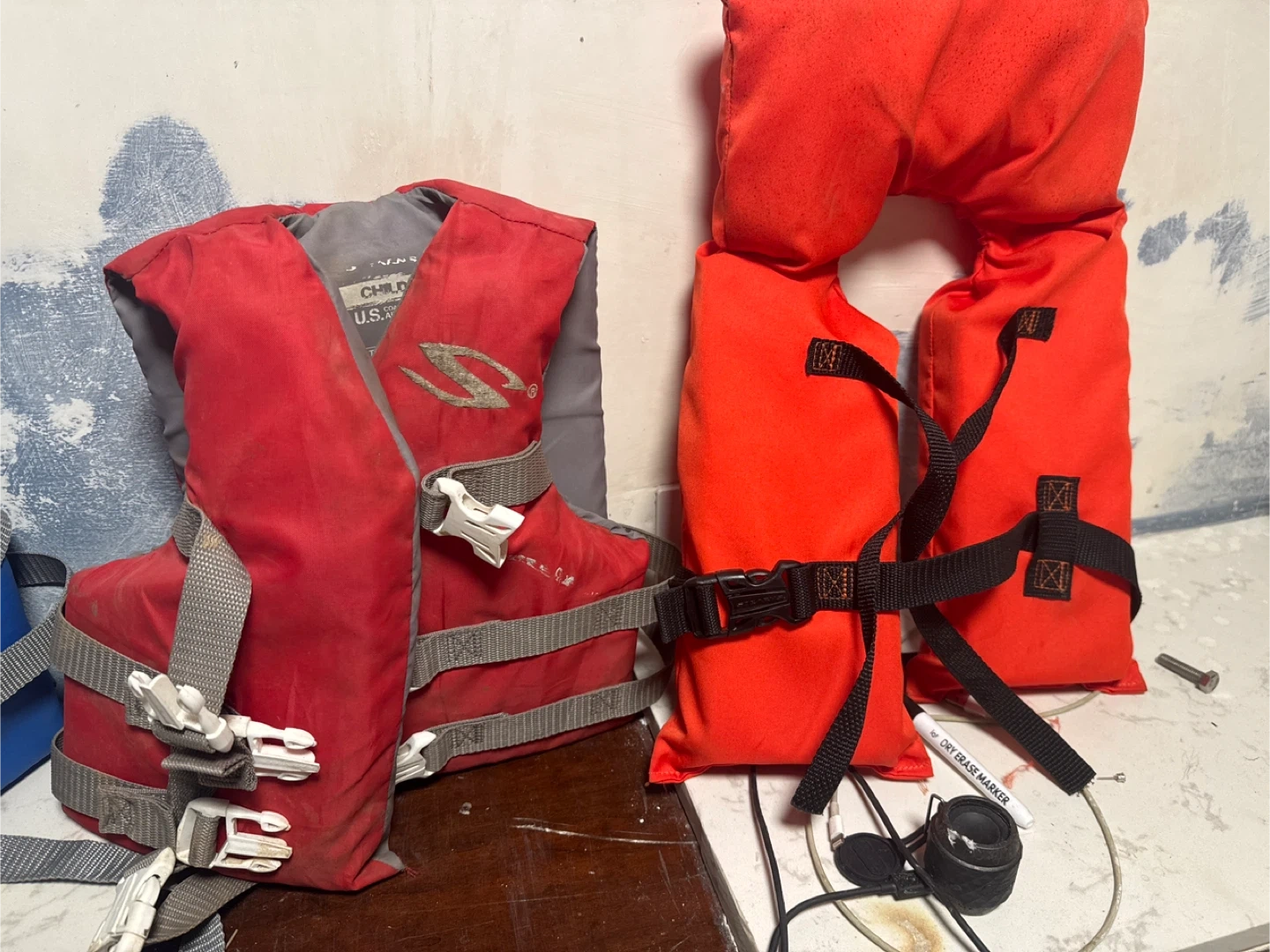 Two child-sized US Coast Guard approved flotation vests. Both are designed for users weighing 30-50 lbs. One is red and gray, the other is bright orange. Perfect for water safety!