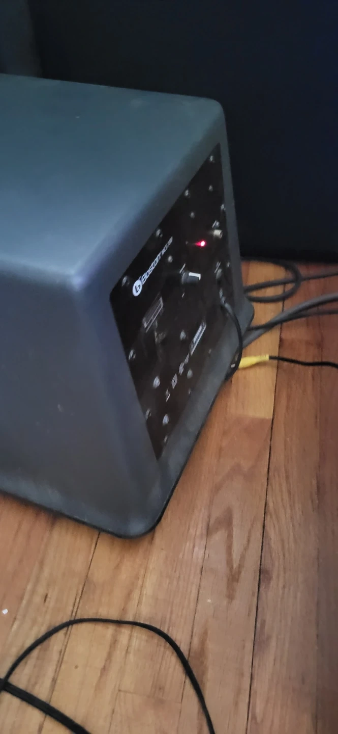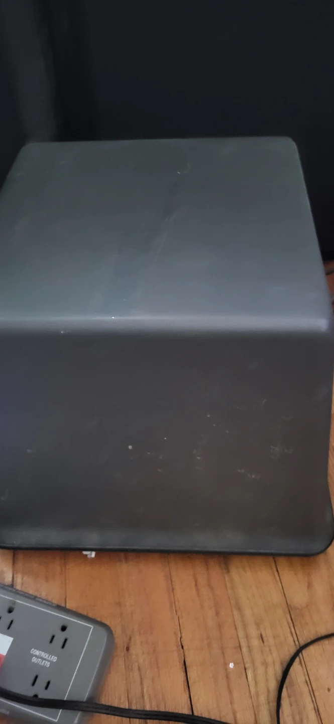 This is a Boston Acoustics HD5 subwoofer. It's designed for home theater systems. The unit has an amplifier and various input/output ports.
