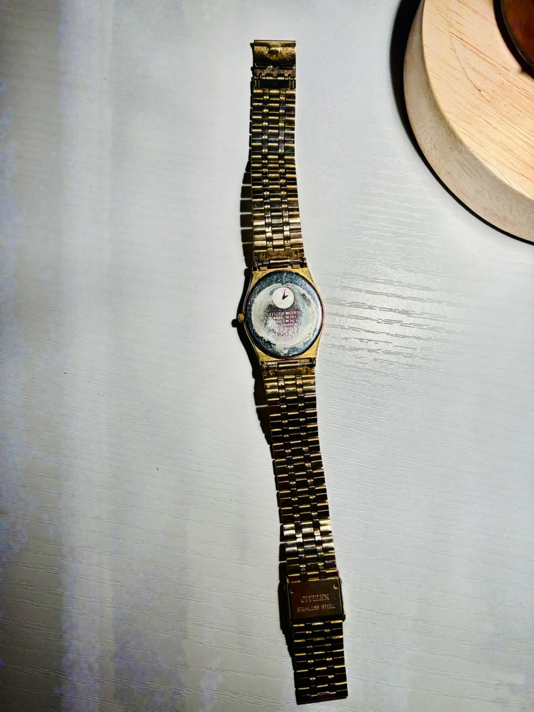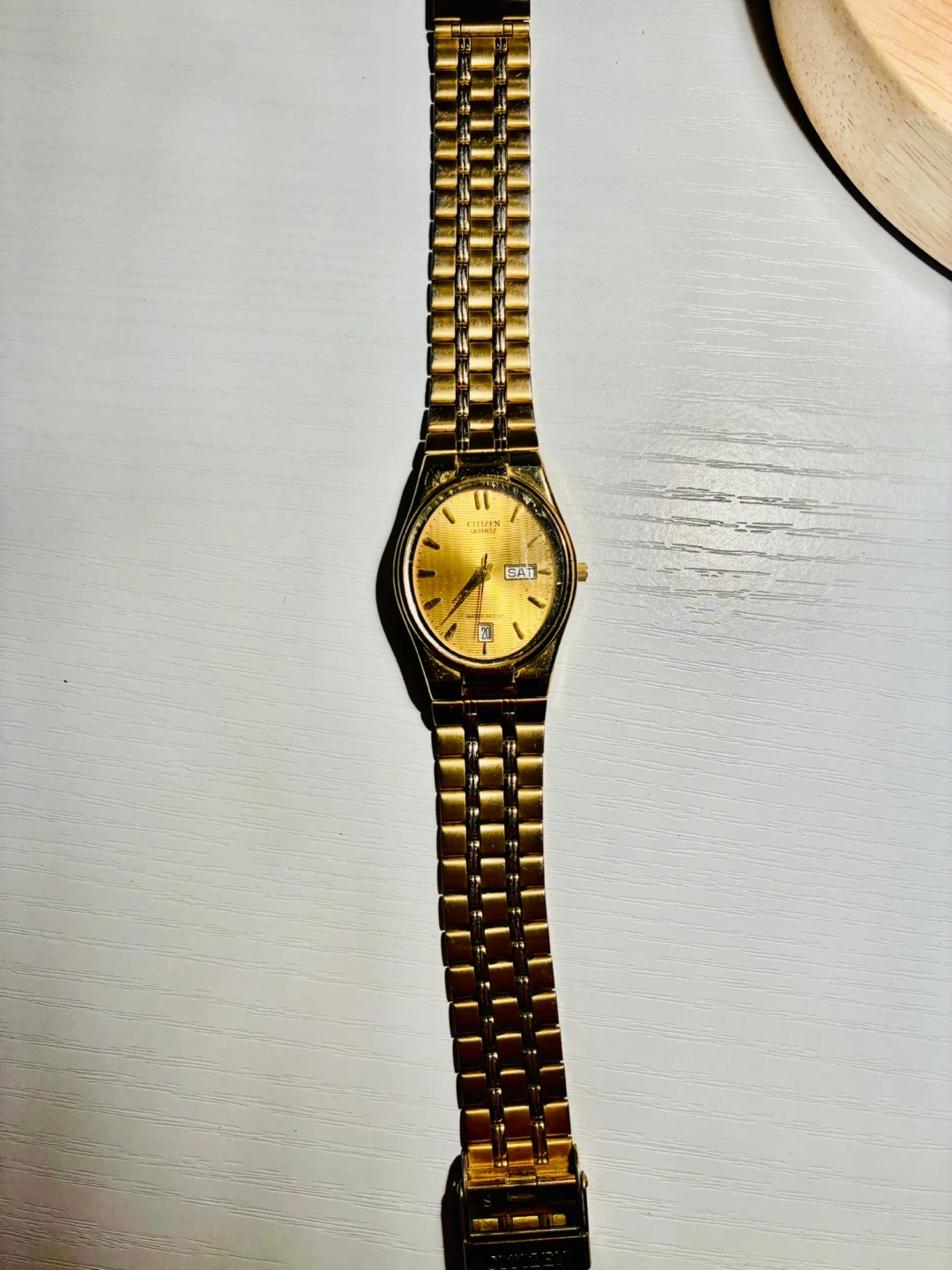 This is a gold-tone Citizen Quartz watch with a day and date display. It features a classic metal band. A quarter is shown for size reference. It’s in perfect working condition and has a new battery installed