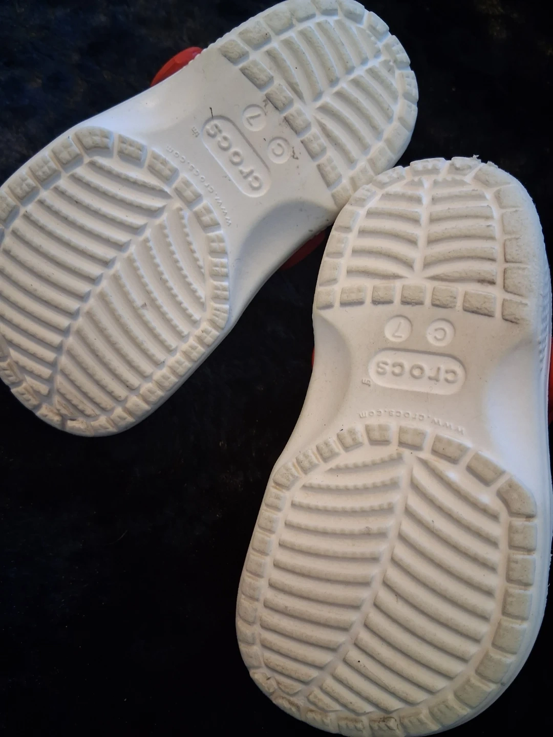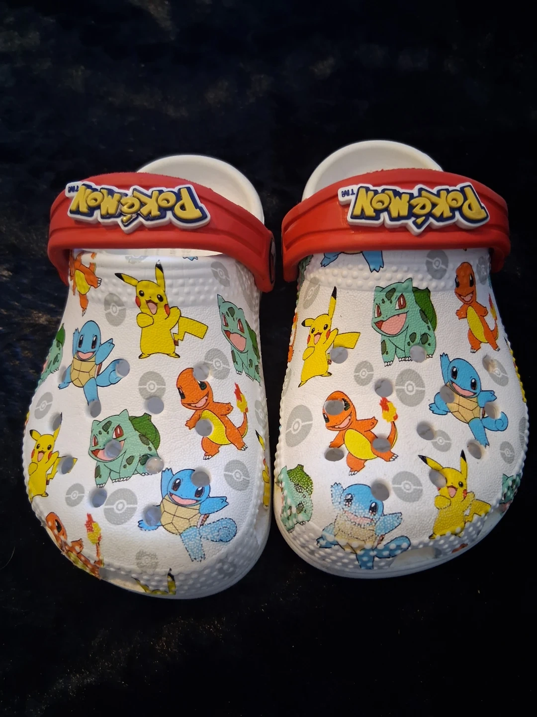 White Crocs clogs featuring a colorful Pokemon print. Red strap with 'Pokemon' logo detail. Easy to clean material. Kids' size 7.