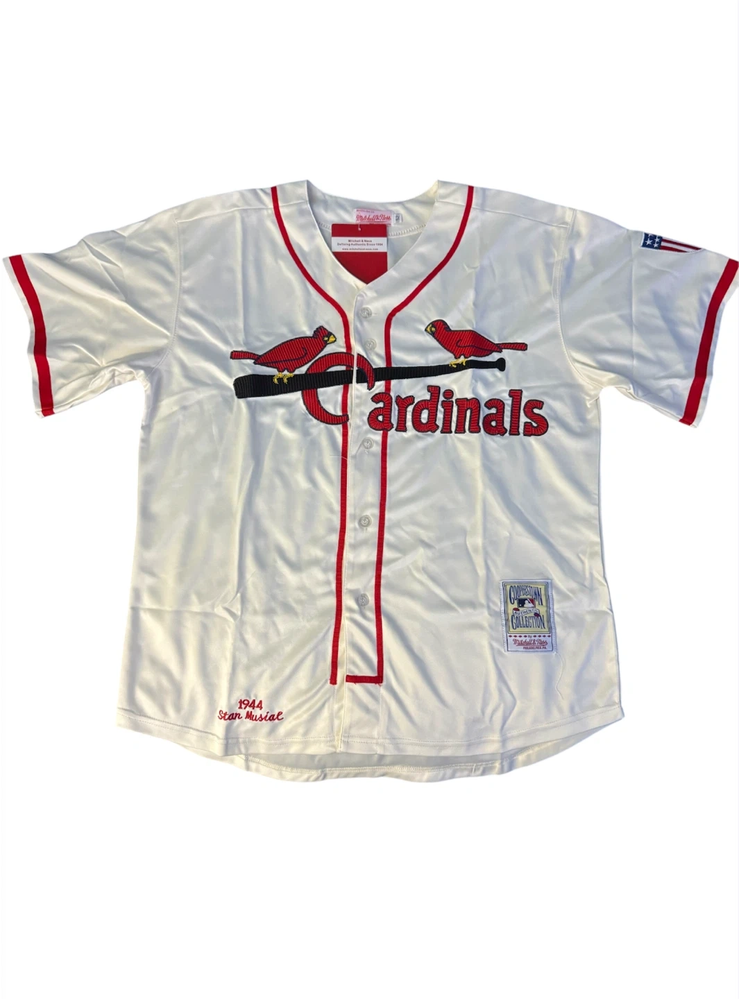 Selling a Mitchell & Ness St. Louis Cardinals Stan Musial 1944 jersey. It's in great condition and features the Cardinals logo with Stan Musial's name and the year 1944 embroidered on the front. The back has the number 6.