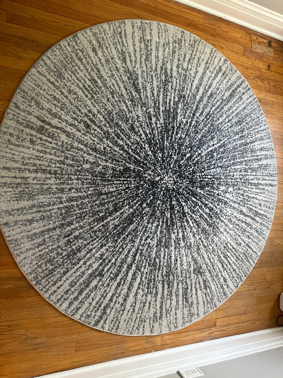 Gray and white round area rug with a sunburst pattern. The rug is soft I used it in my office. Pet and smoke free home. Pick up only. Cash or Venmo only.