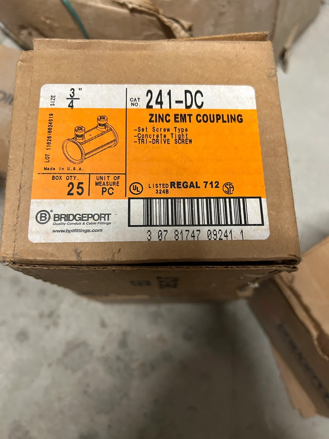 161Bridgeport 241-DC Zinc EMT Couplings. For 3/4" conduit. 25 pieces per box, I have 3 boxes. More than 60 pieces - Set Screw Type - Concrete Tight - Tri-Drive Screwo $15 cash for the lot