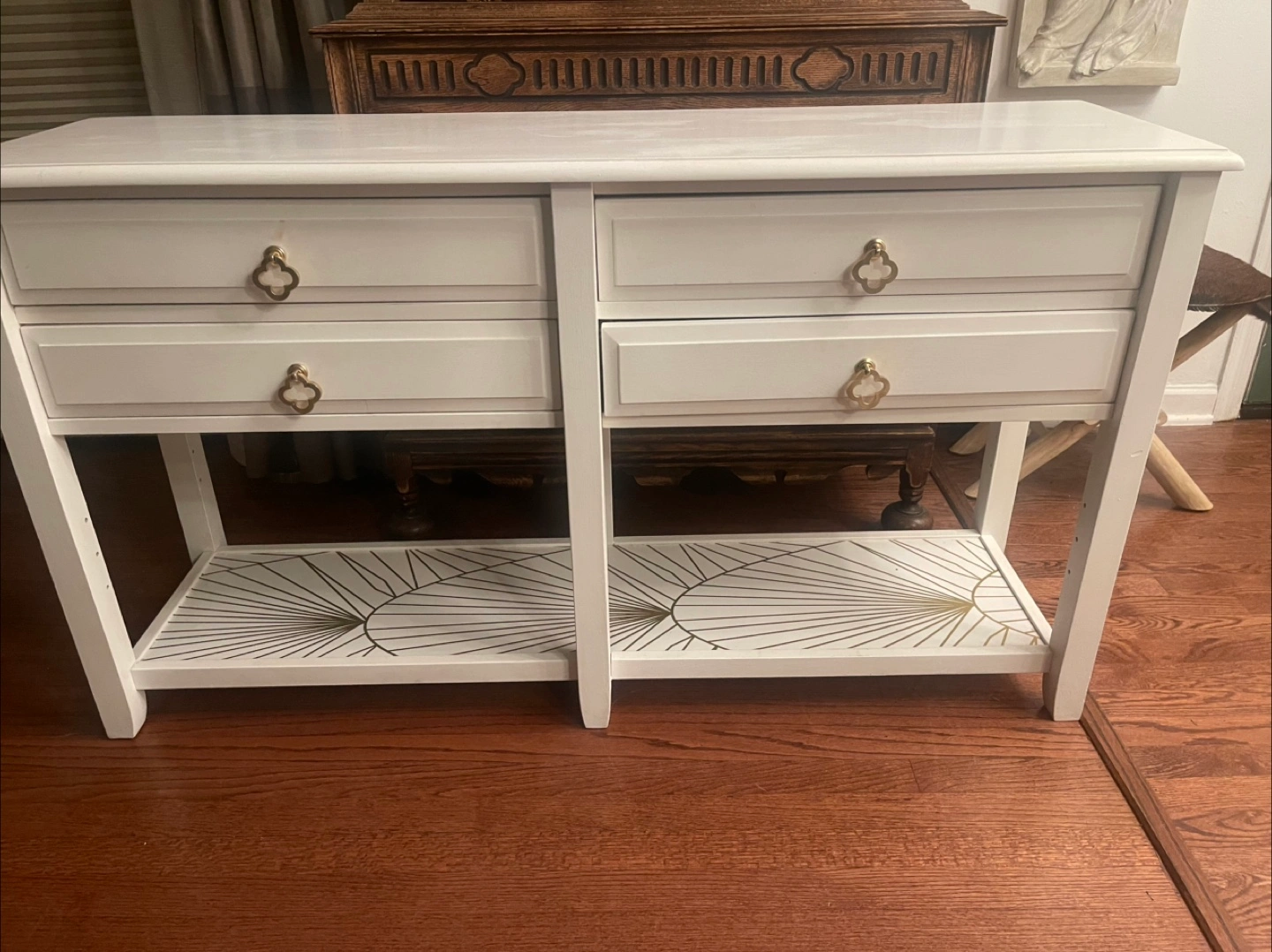 Selling a lovely white console table! It features four drawers with unique gold clover-shaped handles. The bottom shelf has a stylish gold sunburst design. Perfect for adding a touch of elegance to any room!