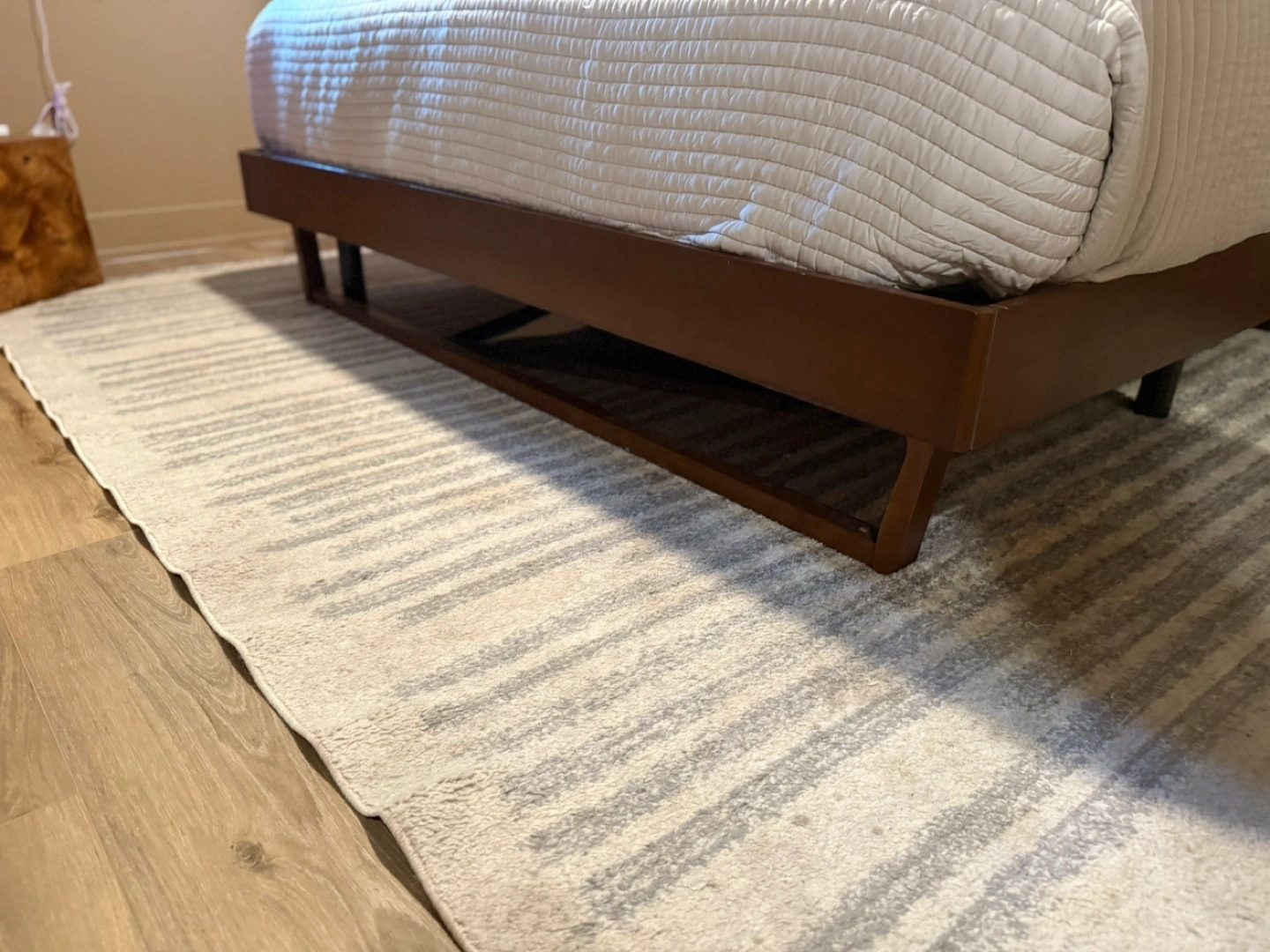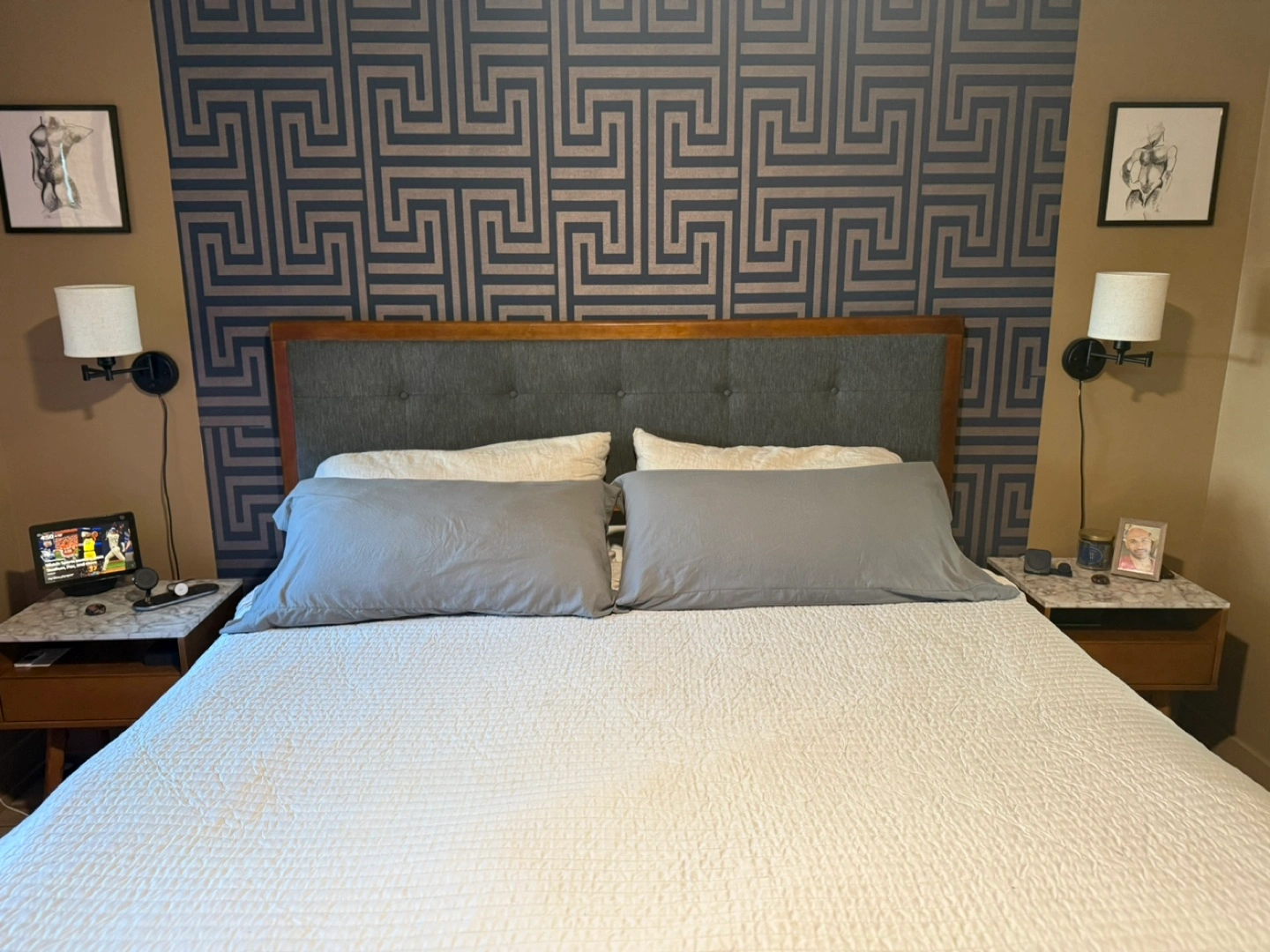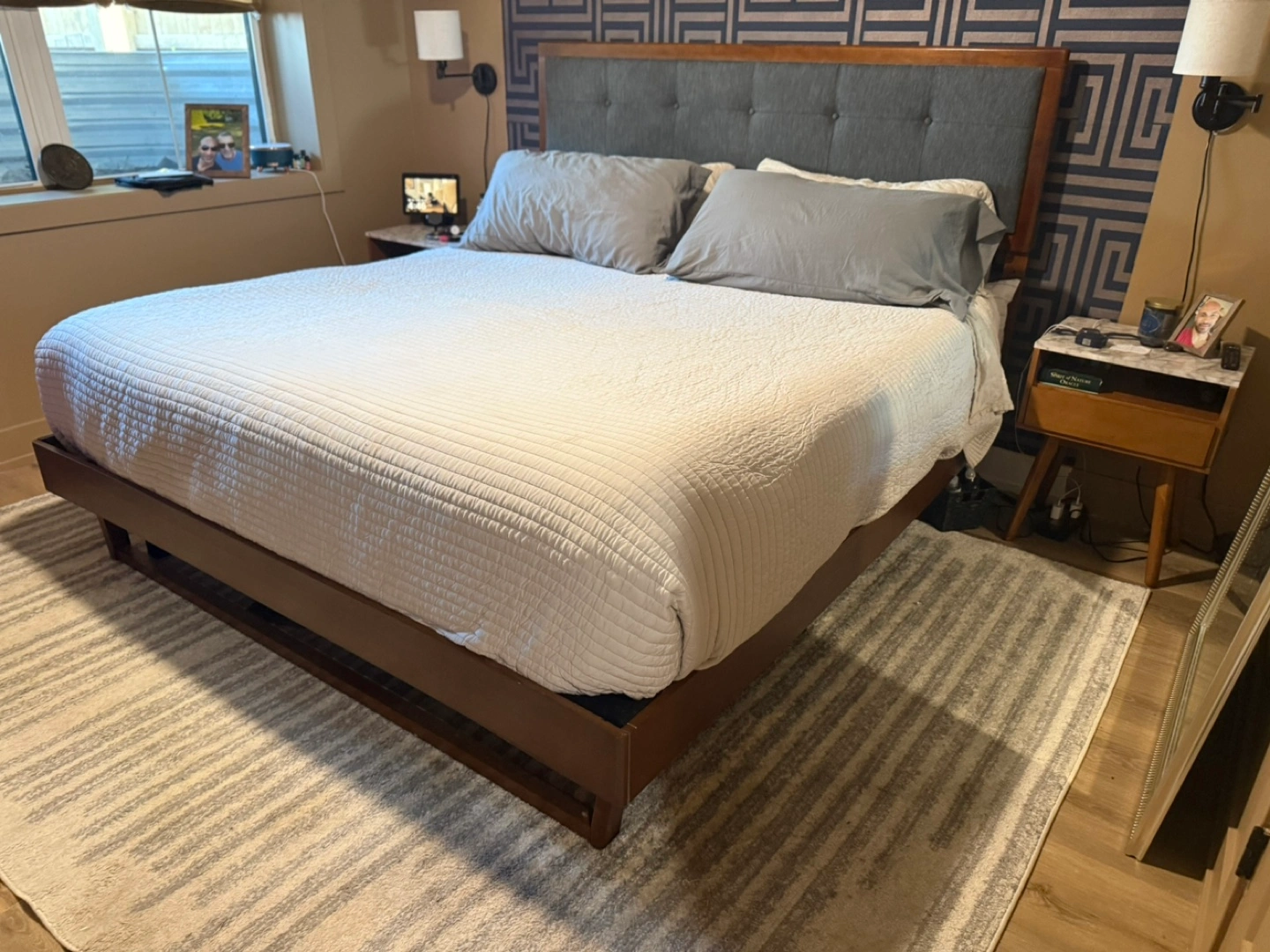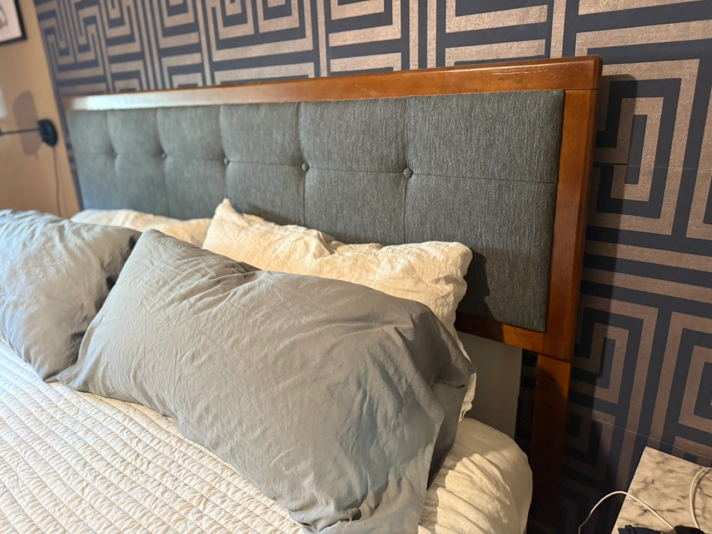 Selling a king size bed frame with a headboard. It's in great condition and ready for a new home! The oak bed frame has a sleek and simple with a tufted grey line. Headboard. The mid-century modern style works great would look great in any bedroom.