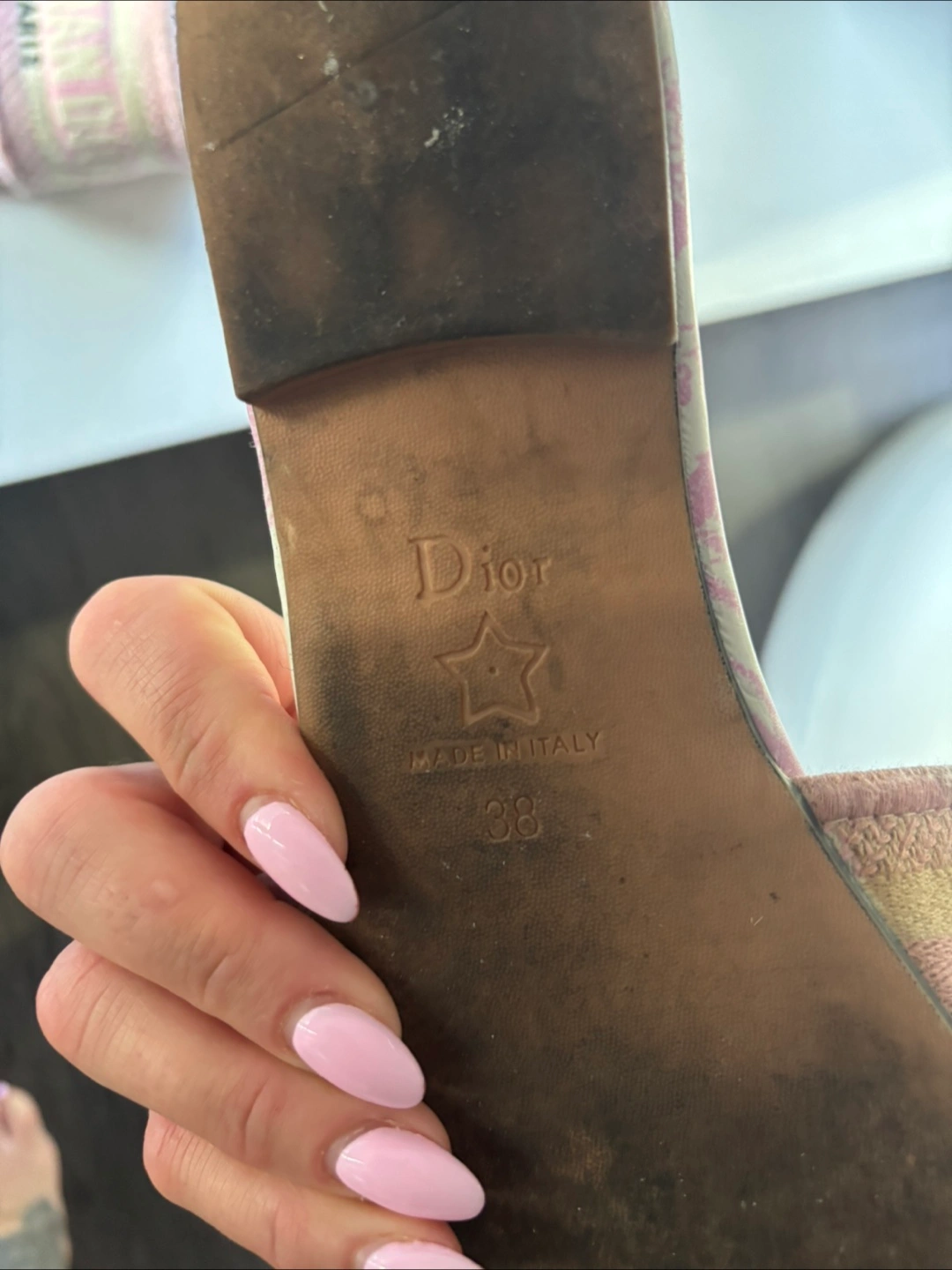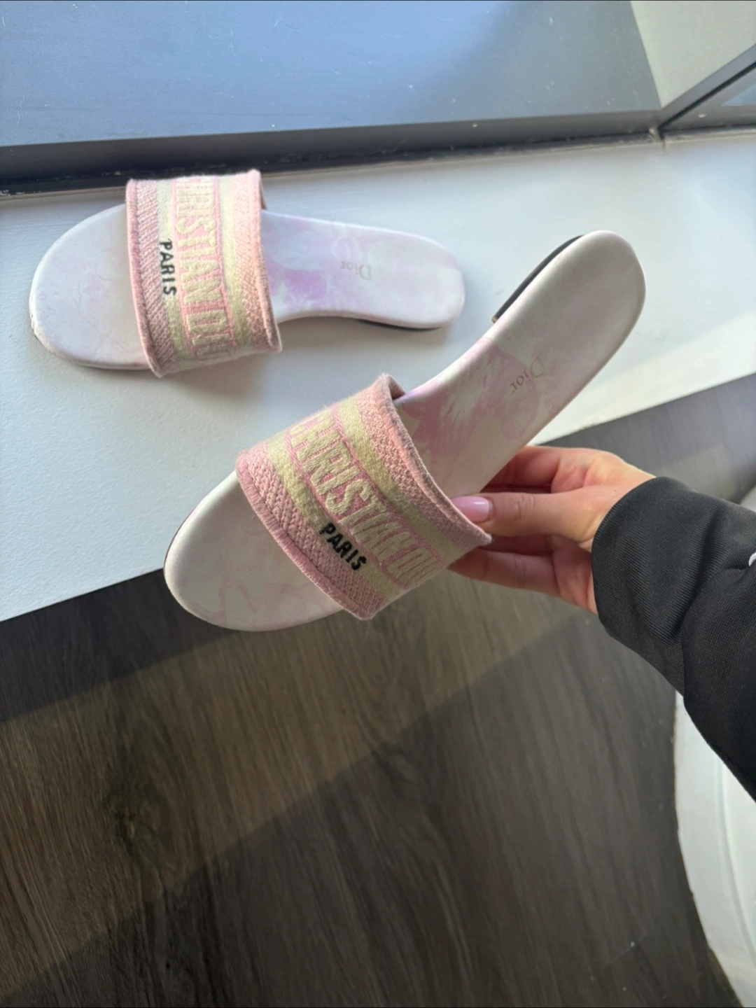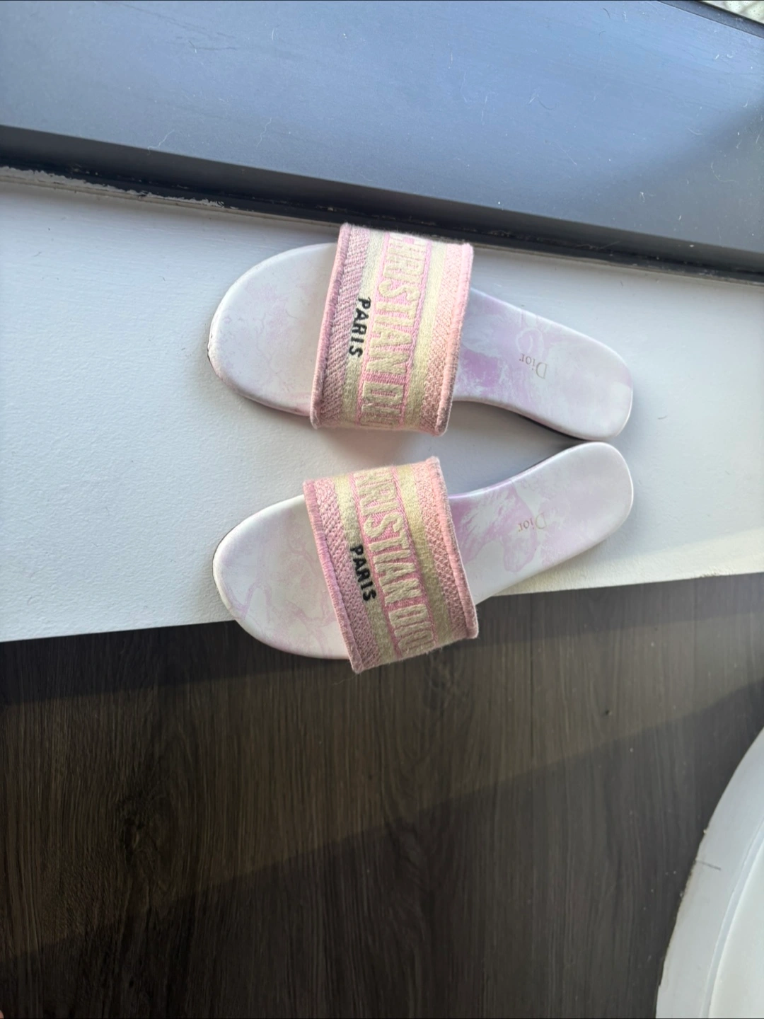 Selling a pair of Dior slides in a lovely pink colour. The slides feature the Christian Dior Paris logo on the strap. They are marked as size 38, made in Italy. Selling at a discounted price because they have been worn!