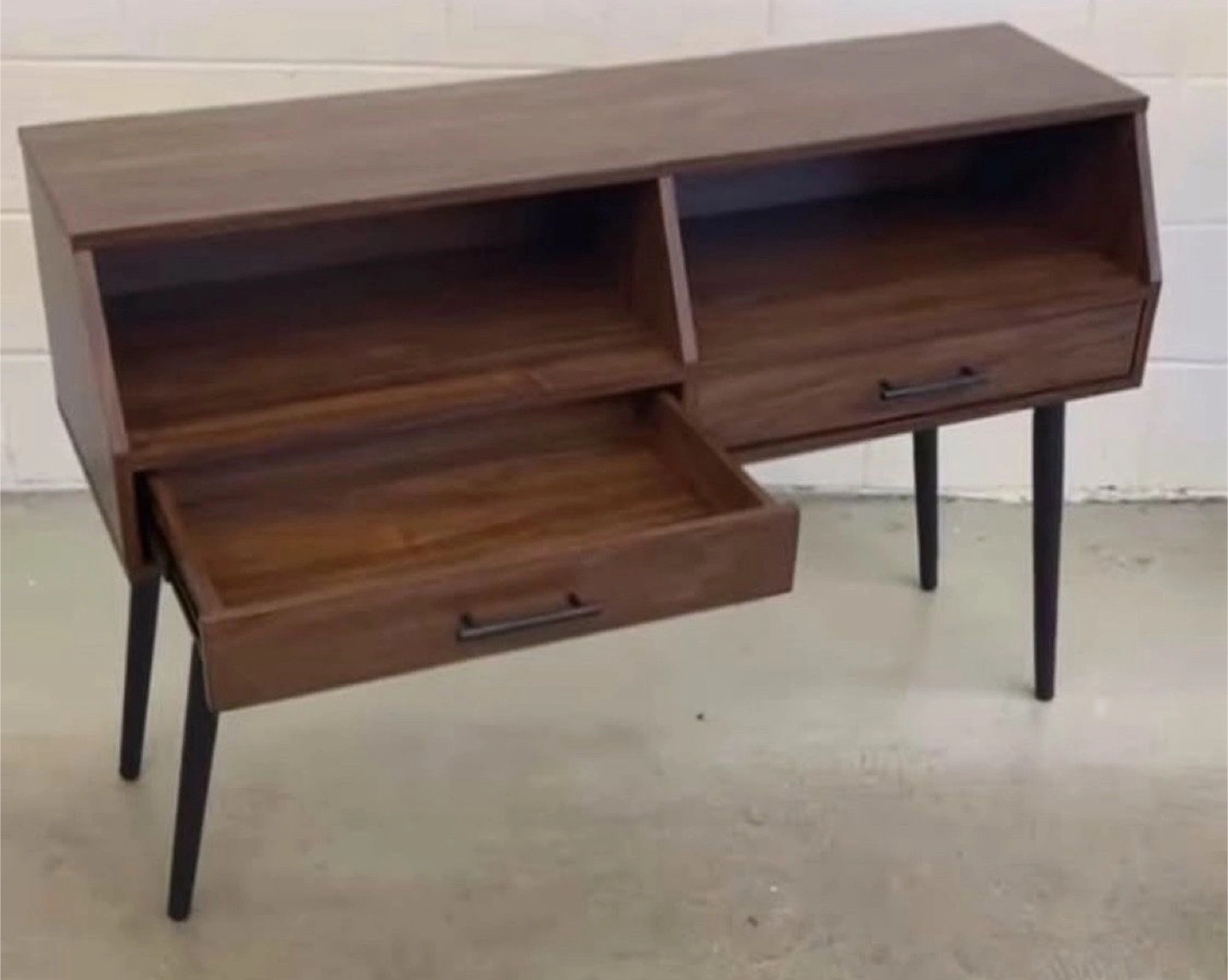 I'm selling a stylish brown wood console table. It features a sleek design with open shelving and drawers for storage. Perfect for adding a touch of elegance to your entryway or living room! For: Hallway, Living Room, Home Office Dimensions: 14"D x 44"W x 30"H Features: * 2 drawers on smooth, metal gliders offer ample closed storage * 2 divided open cubbies provide extra display space * Tapered metal legs and angled front lends a sleek, modern look * Display in your entryway, hallway, living room, or home office TRUSTED SELLER - Read/See My Reviews