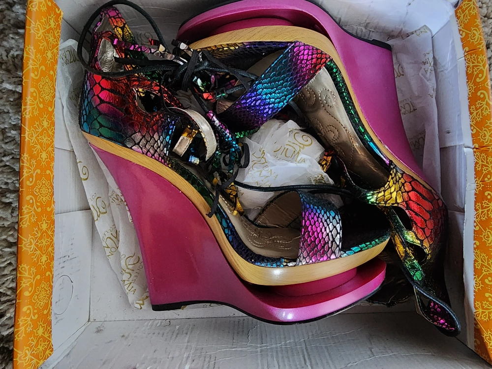 These eye-catching Mona Mia Collezioni wedge heels are sure to turn heads! They feature a vibrant, multicolored snakeskin-like pattern and a fun, strappy design. The size is US 10, and they come with the original box. Never worn.