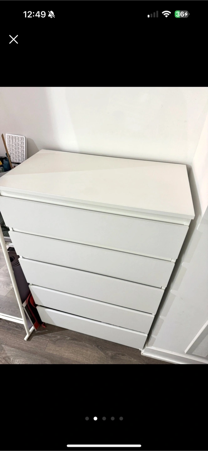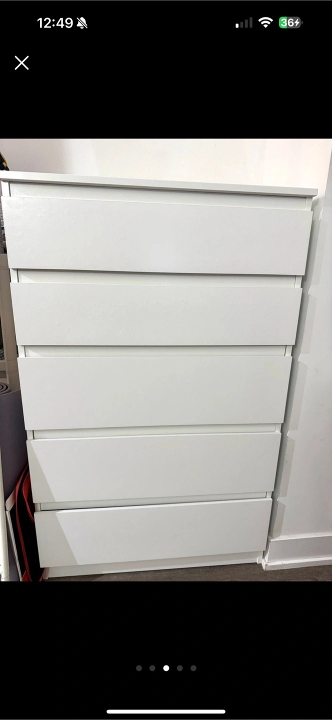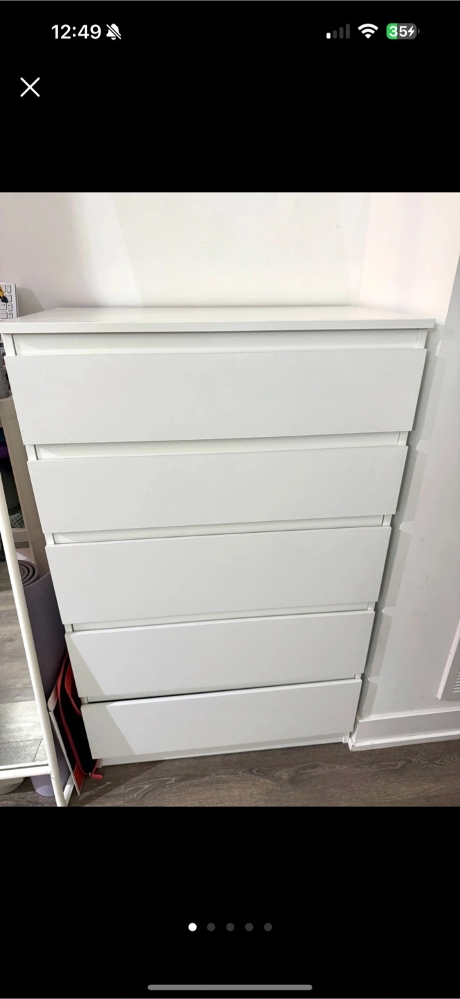 Selling a white IKEA Malm dresser with 5 drawers. It's in great shape and perfect for adding storage to any room. The drawers slide smoothly and are nice and deep. A simple and functional piece! Only Pickup- I don't have a car so no delivery. Close to Eglinton station.