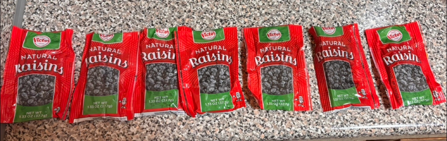 1000+Selling 7 individual packs of Victor Natural Raisins. Each pack contains 1.33 oz (37.7g) of raisins.