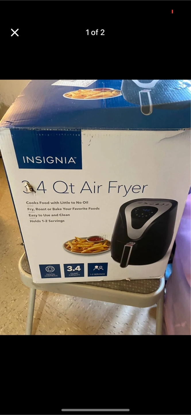 Selling an Insignia 3.4 Qt Air Fryer. It cooks food with little to no oil, making it a healthier alternative to deep frying. It's easy to use and clean, and holds 1-2 servings. The digital control panel allows you to preset programs and adjust the time and temperature. It also has a nonstick basket with a basket release button. Open box use 3 times. price is $100 but willing to let it go best offer takes it.