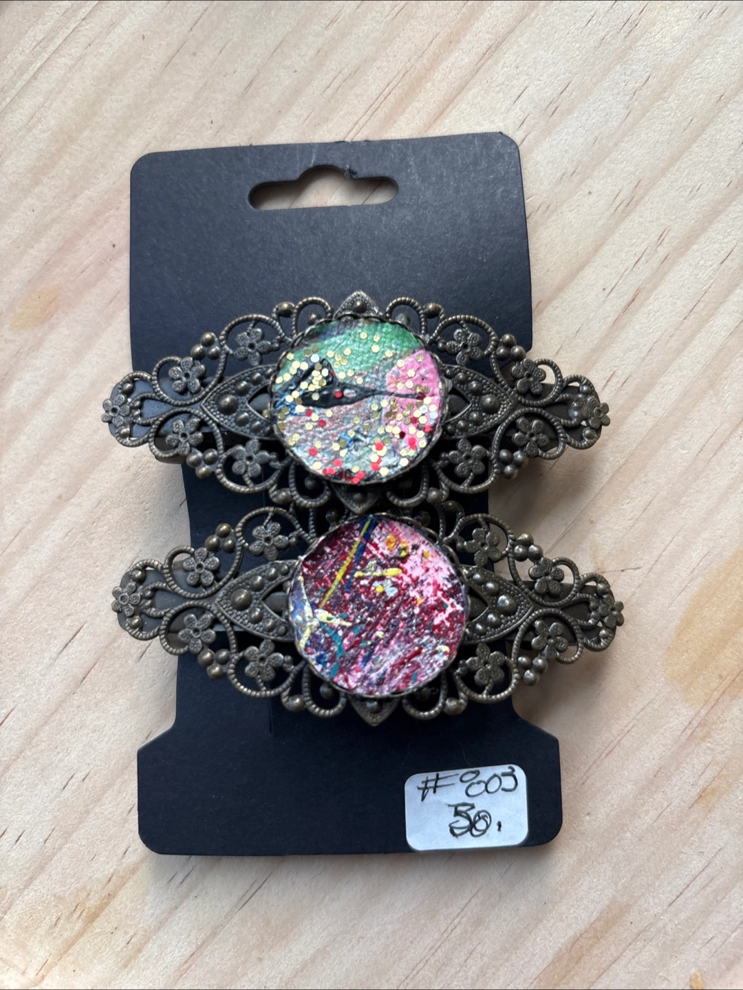 Here's a set of two vintage-style hair clips! They feature intricate filigree detailing and colorful, eye-catching centerpieces. These clips add a touch of old-world charm to any hairstyle. Handcrafted one of a kind. Send date and time preference for purchase before 8 pm on East 34th Street and 1st Avenue across from NYU Hospital. Cash only. No Zelle.
