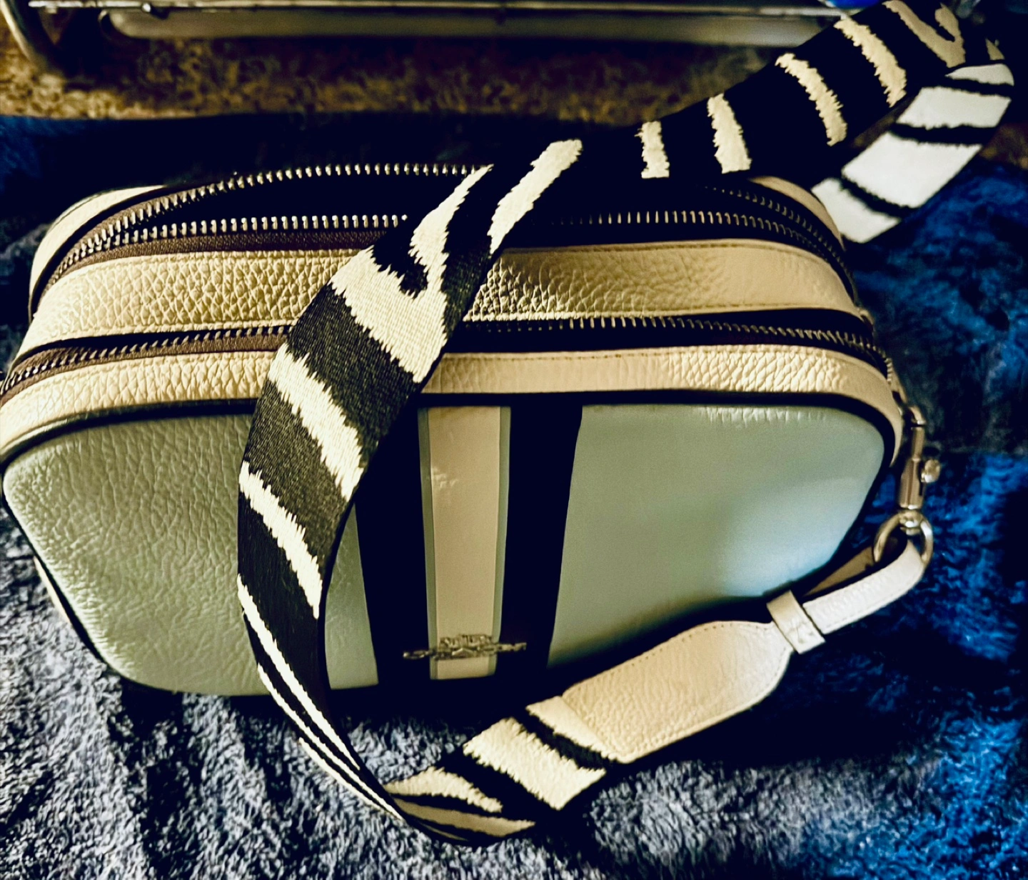 New style Coach crossbody bag in sky blue. Features bold striped design and adjustable strap. Perfect for everyday use. Used only once, excellent condition Ready for a new home ๐ Refined pebble leather Inside multifunction pocket Double zip closure, fabric lining Outside slip pocket Detachable strap with 22" drop for shoulder or crossbody wear 9 3/4" (L) x 6 1/4" (H) x 3 1/2" (W)