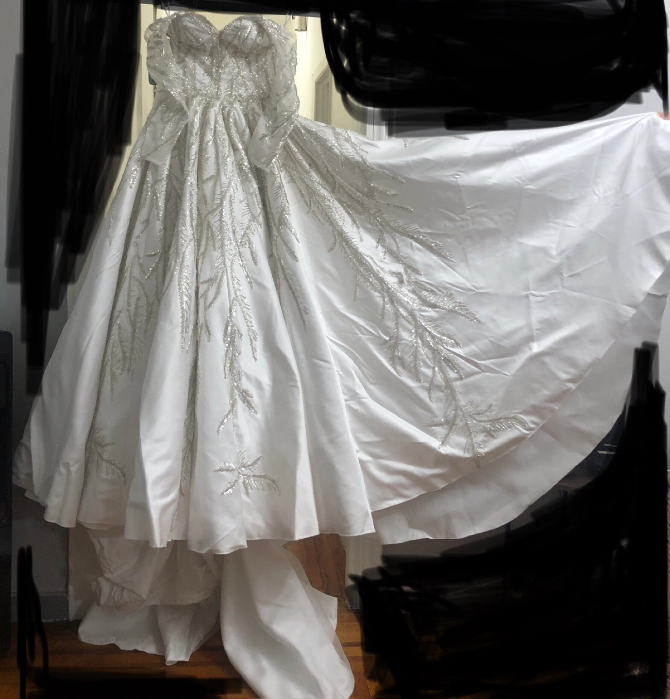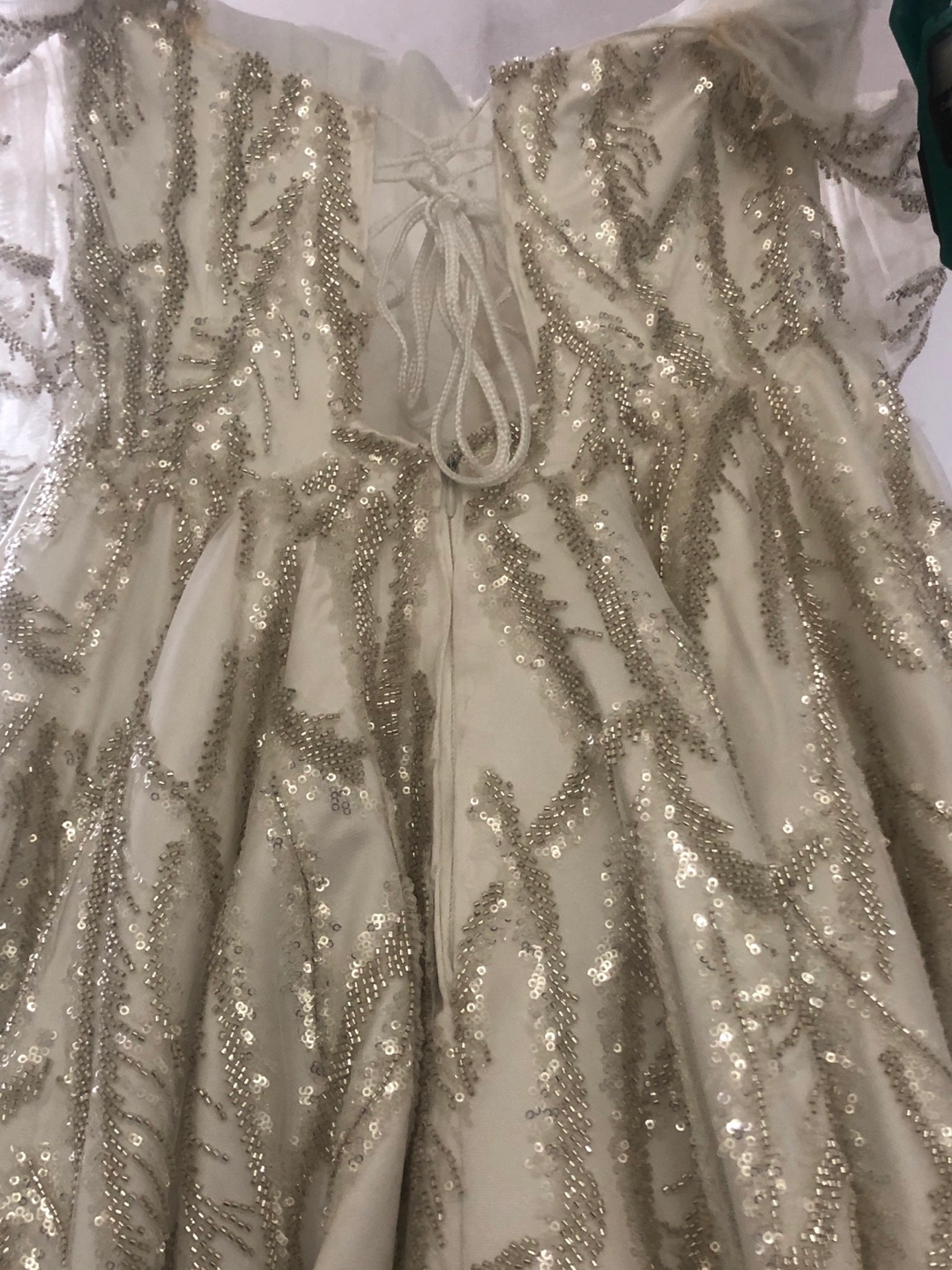 Selling a beautiful white wedding dress with silver details. It's in great condition and ready for its next special day! The dress features intricate silver embellishments and a lovely design. It's a stunning piece that will make any bride feel amazing