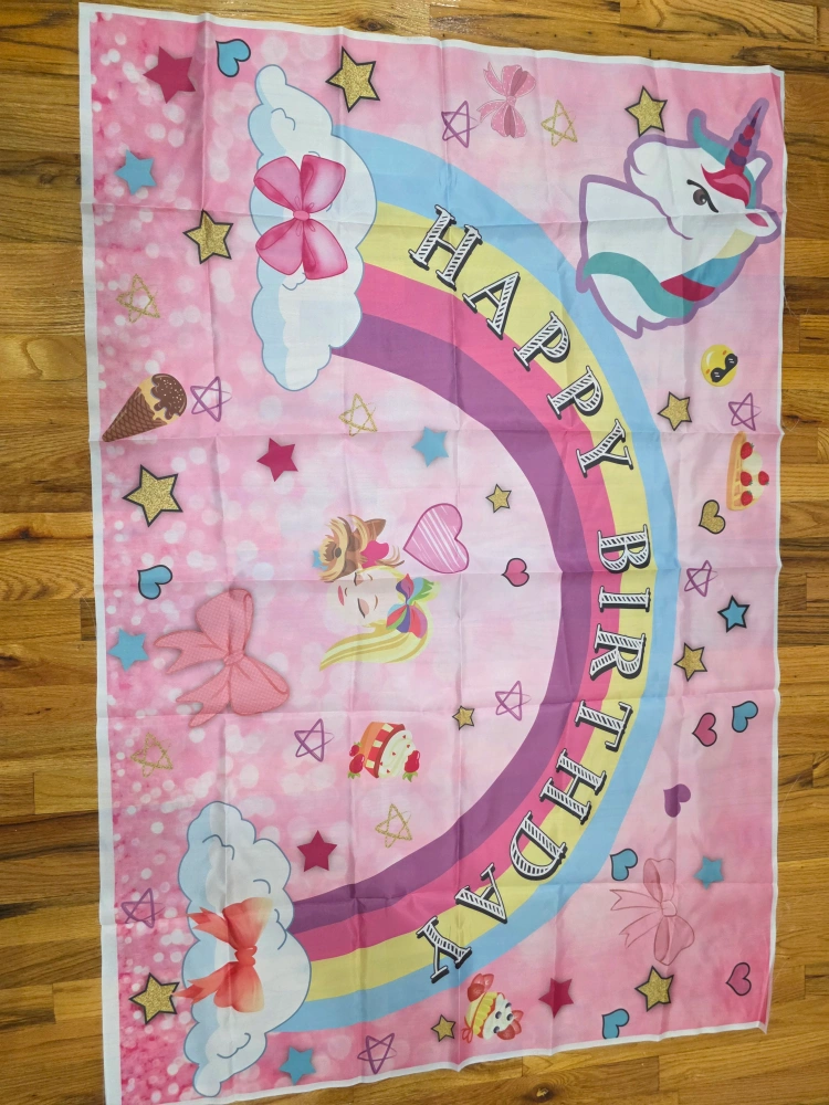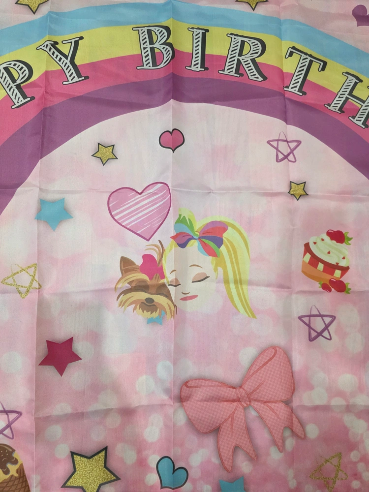 This is a JoJo Siwa themed Happy Birthday backdrop. It features a colorful design with rainbows, stars, hearts, and JoJo Siwa herself. Perfect for a birthday party decoration! 40" × 58" free cupcake picks and pin