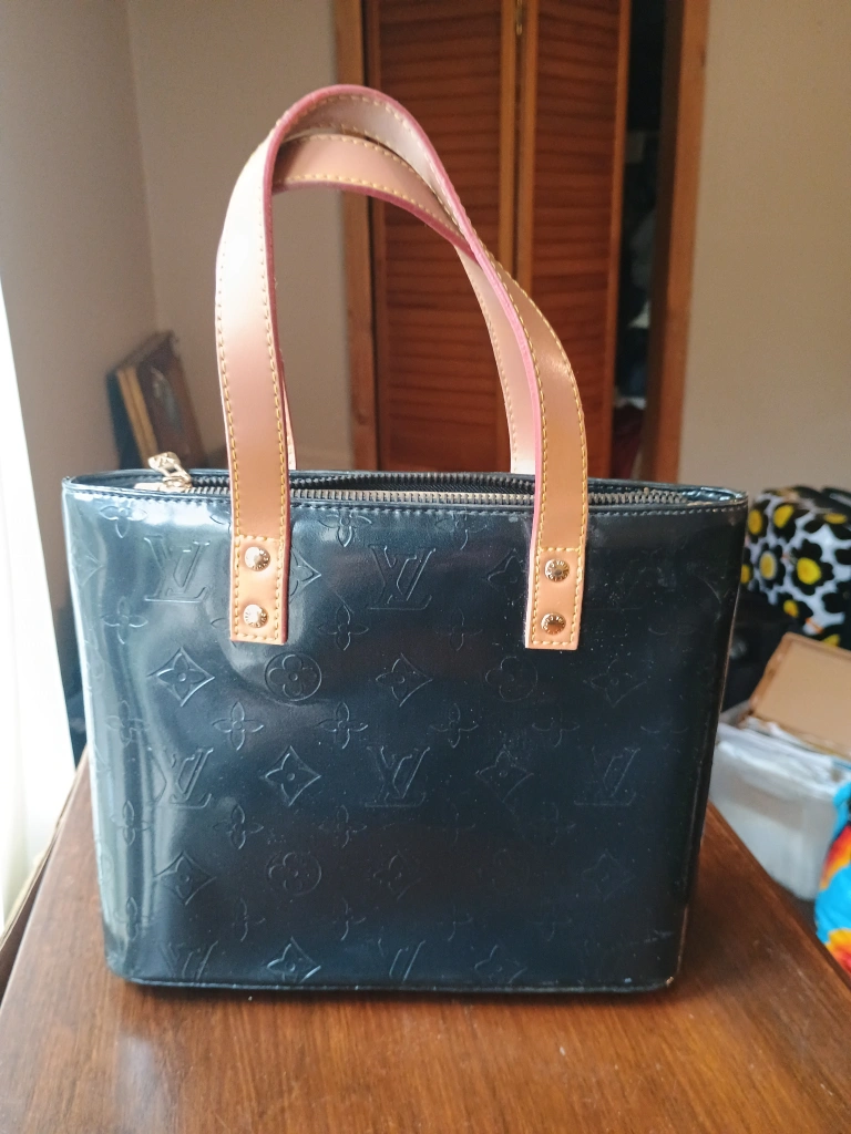 This is a Louis Vuitton Vernis tote bag. It features the classic LV monogram embossed throughout. The handles are a light tan color. It's a stylish and functional bag for everyday use!