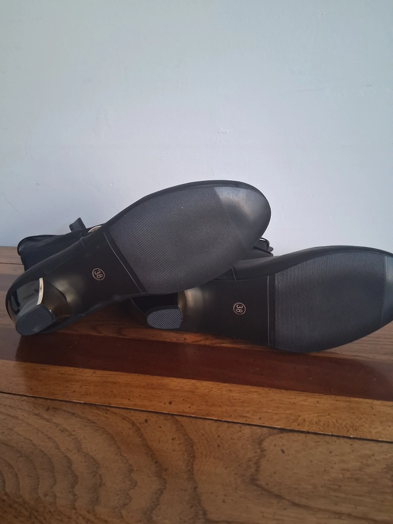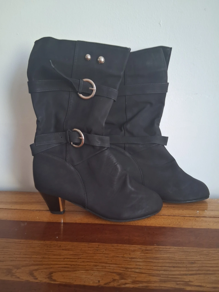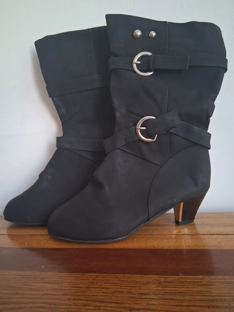 Selling a pair of black heeled boots in size 38. They feature buckle detailing and are in good condition. Perfect for adding a touch of style to your wardrobe! Brand new, never been worn, from wish/temu.
