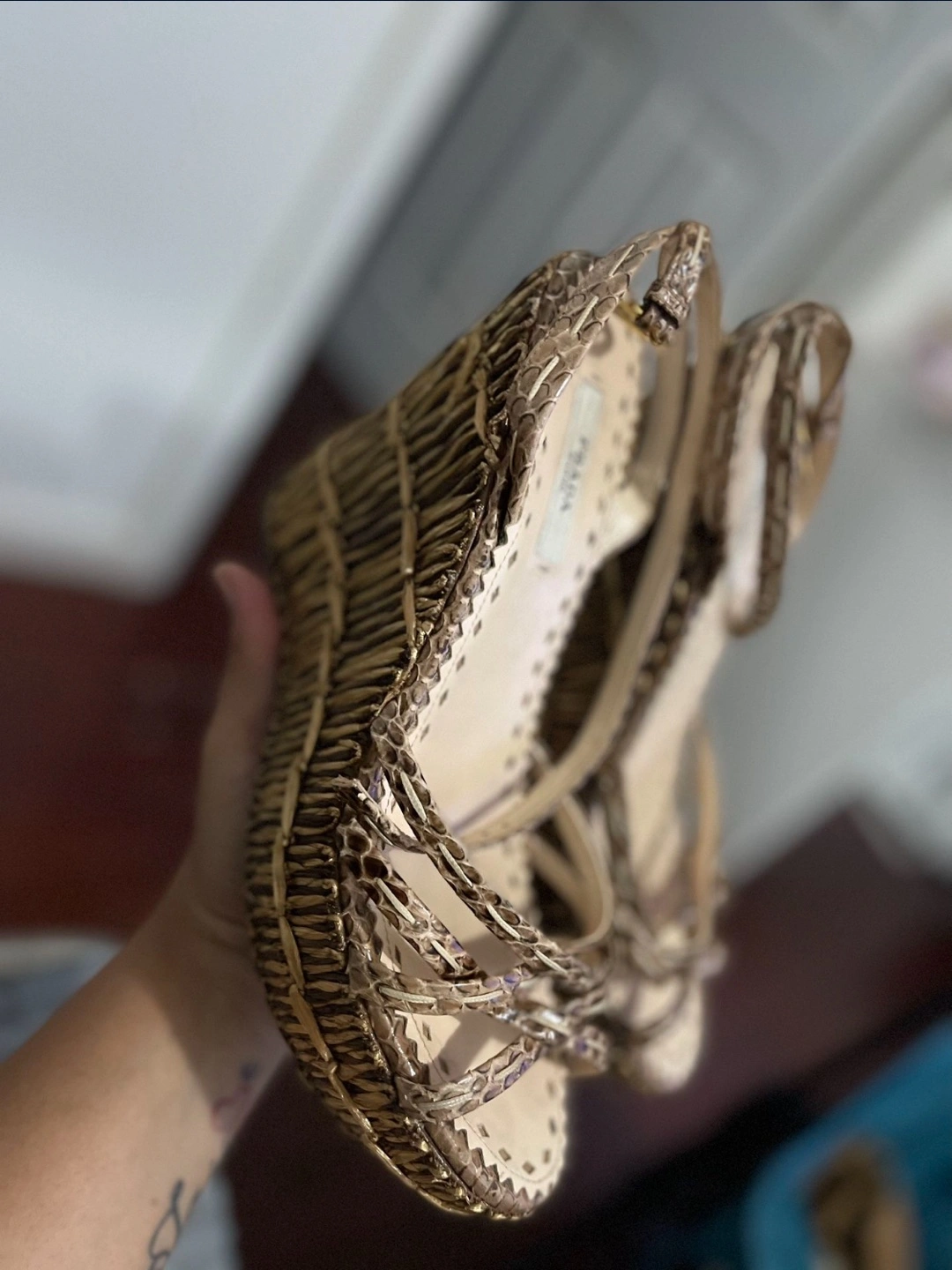 90Selling a pair of Prada wedge sandals in a unique snakeskin pattern! They are a size 37.5. Perfect for adding a touch of luxury to your wardrobe