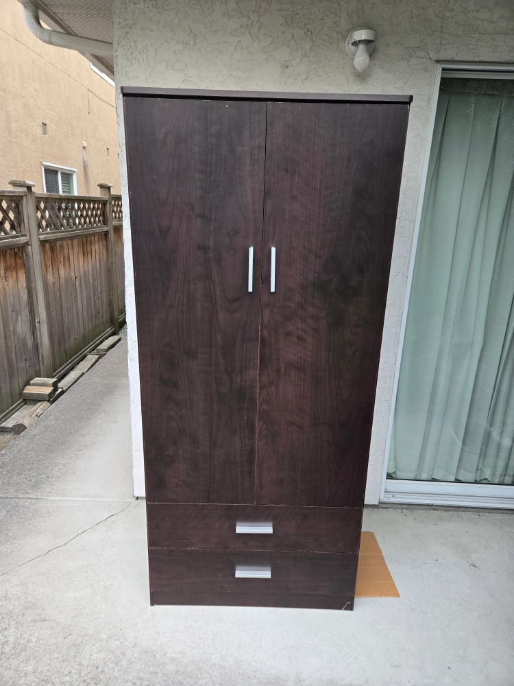 Looking to give this dark brown wooden wardrobe a new home! It features two doors that open to a hanging rod and a shelf, plus two drawers at the bottom for extra storage. Perfect for adding some extra closet space. There are some nicks on the inside.