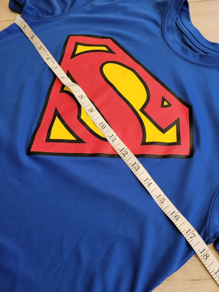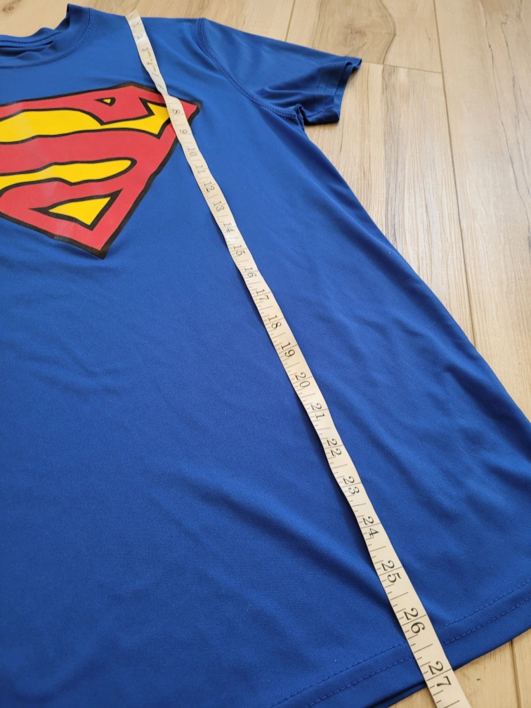 Selling a blue Superman t-shirt in size small. It is made of 100% polyester. There is a small scratch on the logo, as shown in the pictures. Approximately 18 inches from pit to pit and 27 inches long from shoulder to bottom of shirt. Feel free to check out my other unique items listed.