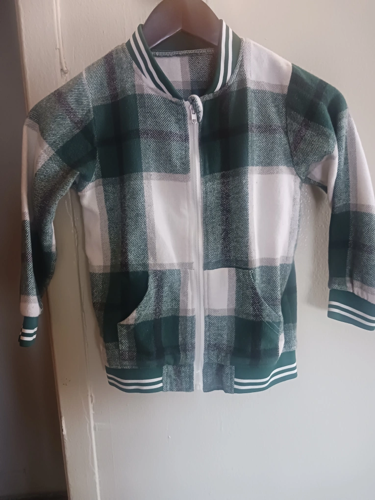 Here's a cute green and white plaid bomber jacket! It features a full zip front and two pockets. Perfect for layering or wearing on its own.