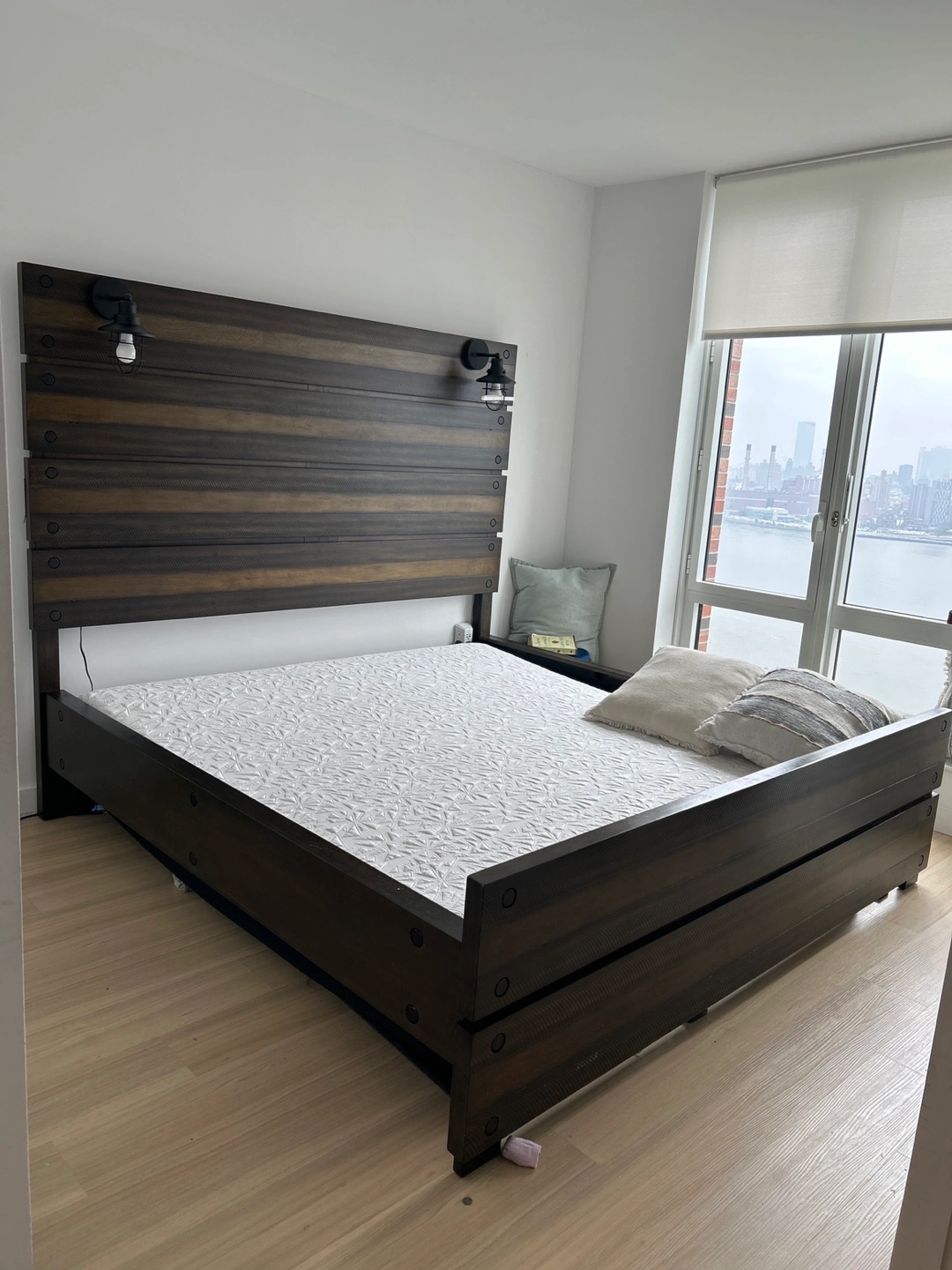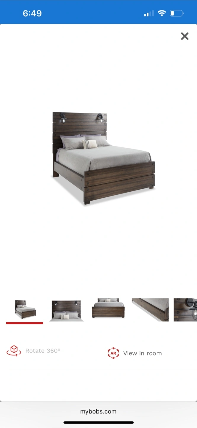 Selling a king size bed from Bob's Discount Furniture! It has a rustic design and is in great condition. The bed frame is a dark brown color and features a headboard with built-in lights. It's a sturdy and stylish piece that would look great in any bedroom