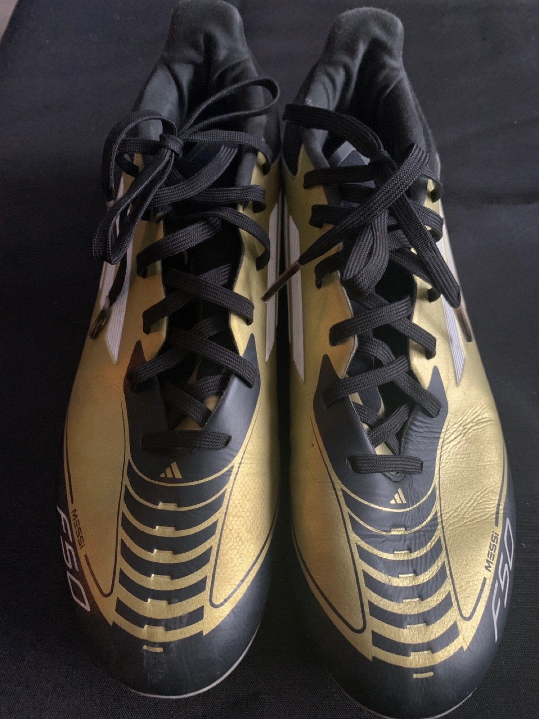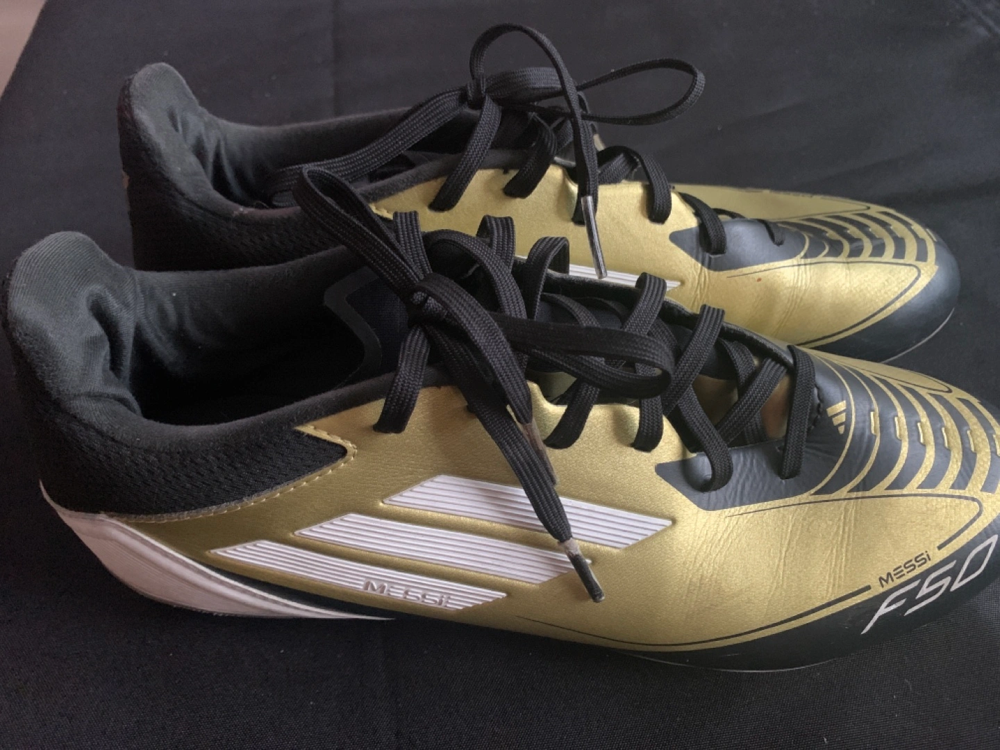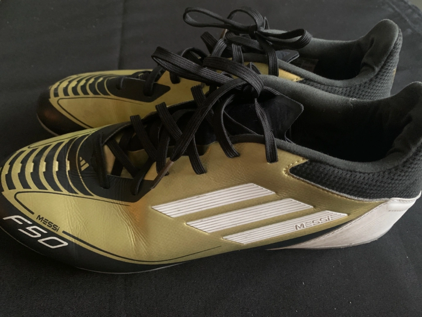 Selling a pair of Adidas Messi F50 soccer cleats in a striking gold and black colorway! They're in good condition and ready for the field. - Brand: Adidas - Model: Messi F50 - Size: US 8