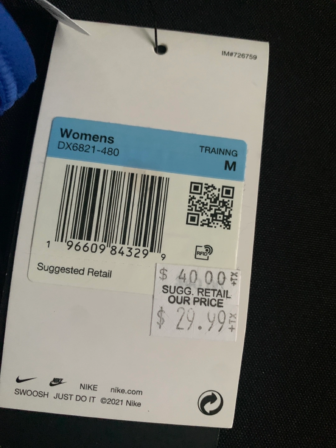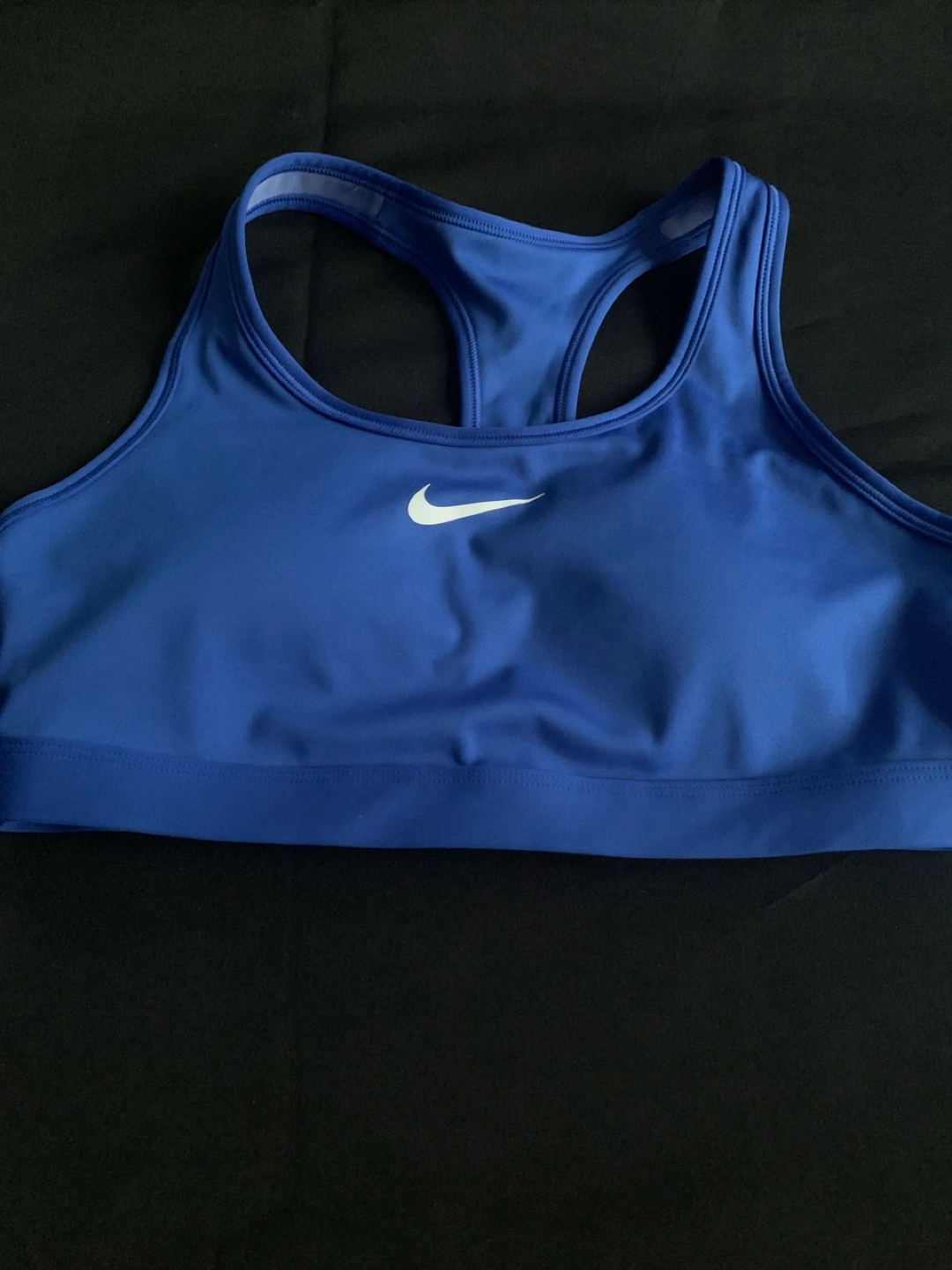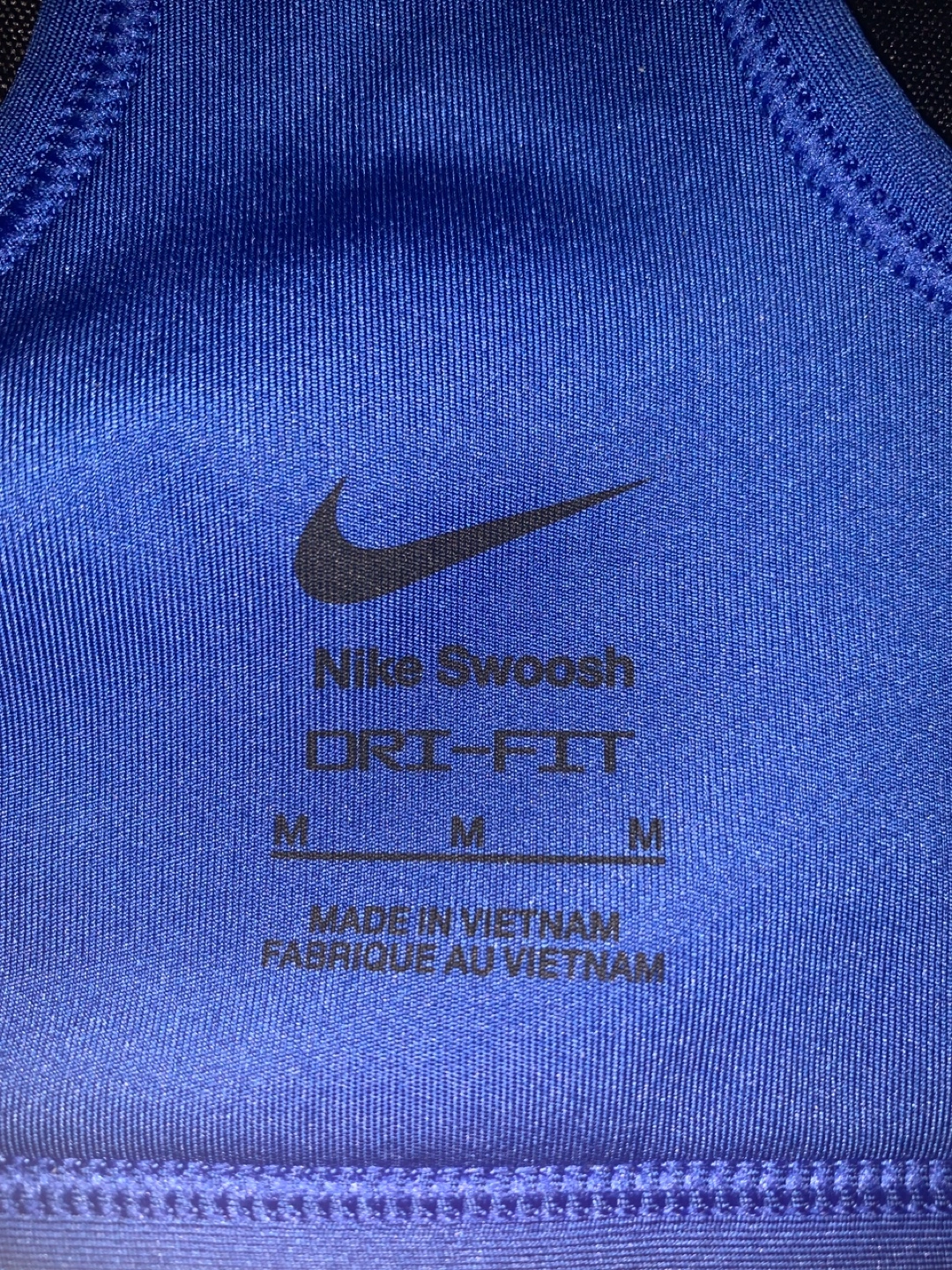 Selling a Nike women's training sports bra in size medium. It's a vibrant blue color and features Nike's Dri-FIT technology to keep you cool and dry during workouts. The tag shows a suggested retail price of $40.00, but I'm offering it at a great price!