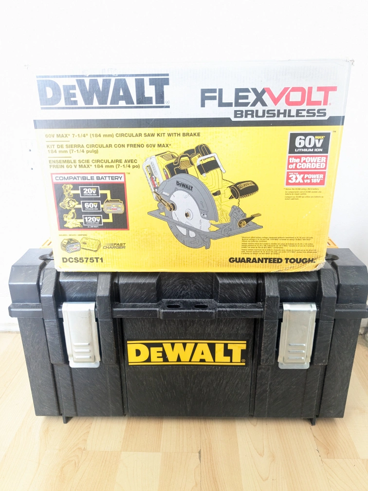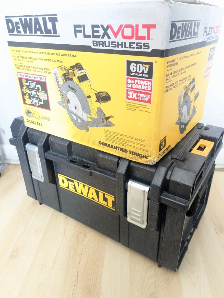 Brand New - 60V Max DeWalt Flexvolt HEAVY -DUTY Circular Saw with Framing Blade - 6AH FLEXVOLT Lithium Power Battery Pack - Fan Cooled FAST CHARGER and Contractor Bag + DeWalt TOUGHSYSTEM Waterproof Large Tool Box... INCLUDED