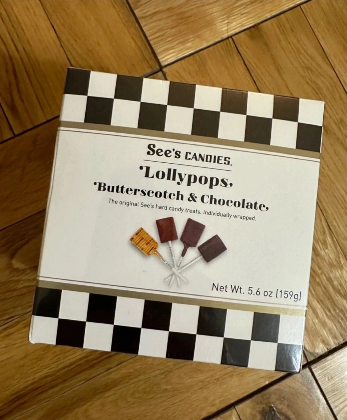 I'm selling a brand new box of See's Candies Lollypops! This box features a delicious combination of butterscotch and chocolate flavors. It's the original See's hard candy treats, individually wrapped for your convenience. The net weight is 5.6 oz (159g). Perfect for a sweet treat!