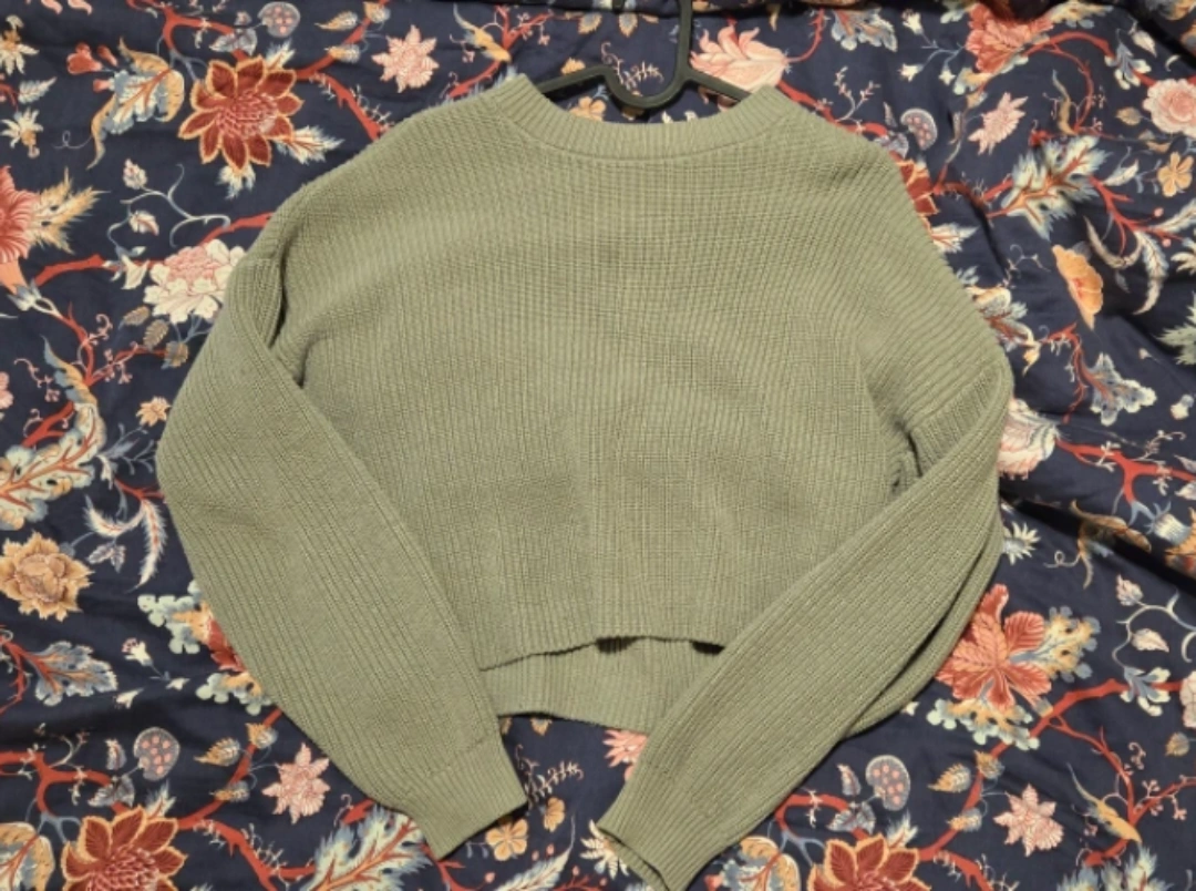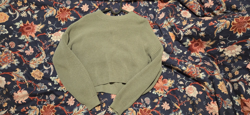 This sweater is in a lovely olive green colour and is perfect for layering or wearing on its own. Perfect for spring, fall or cool summer nights.