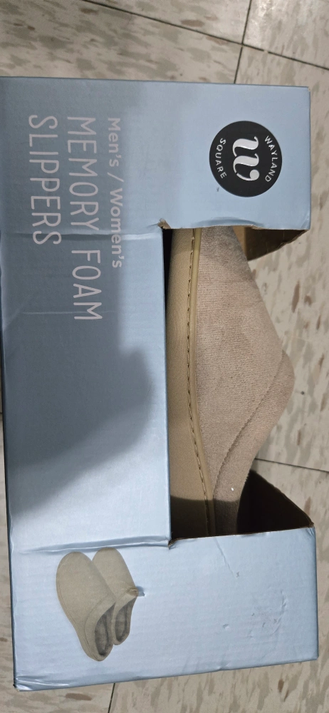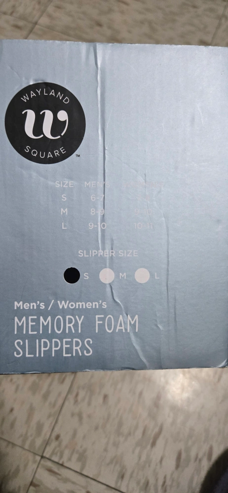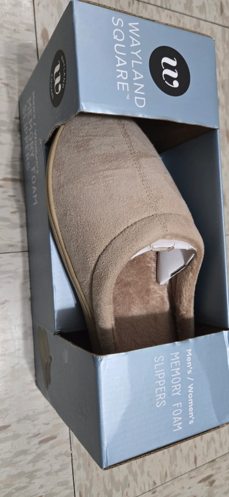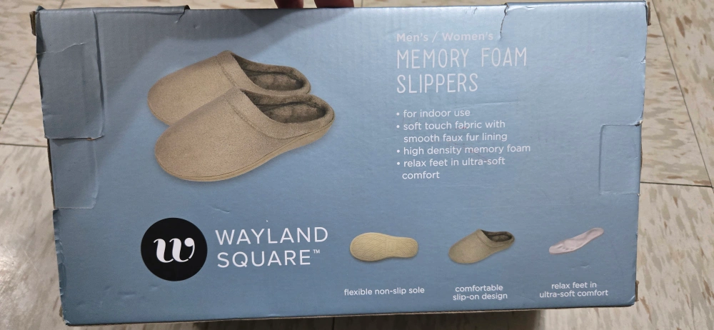 Selling a pair of Wayland Square memory foam slippers in size Medium (Men's 8-9, Women's 9-10). These are brand new and come in the original box! They have a soft-touch fabric with a smooth faux fur lining and high-density memory foam for ultra-soft comfort